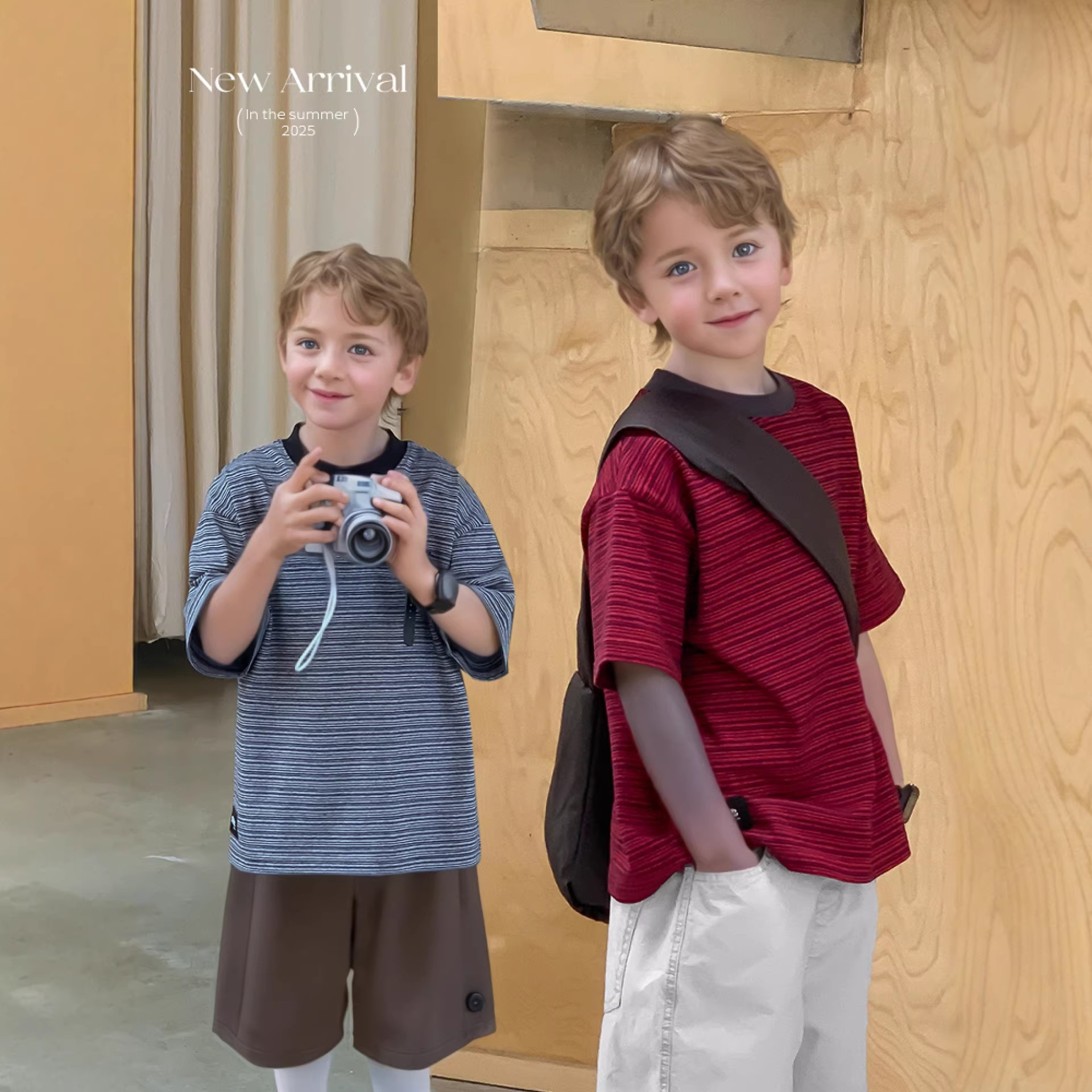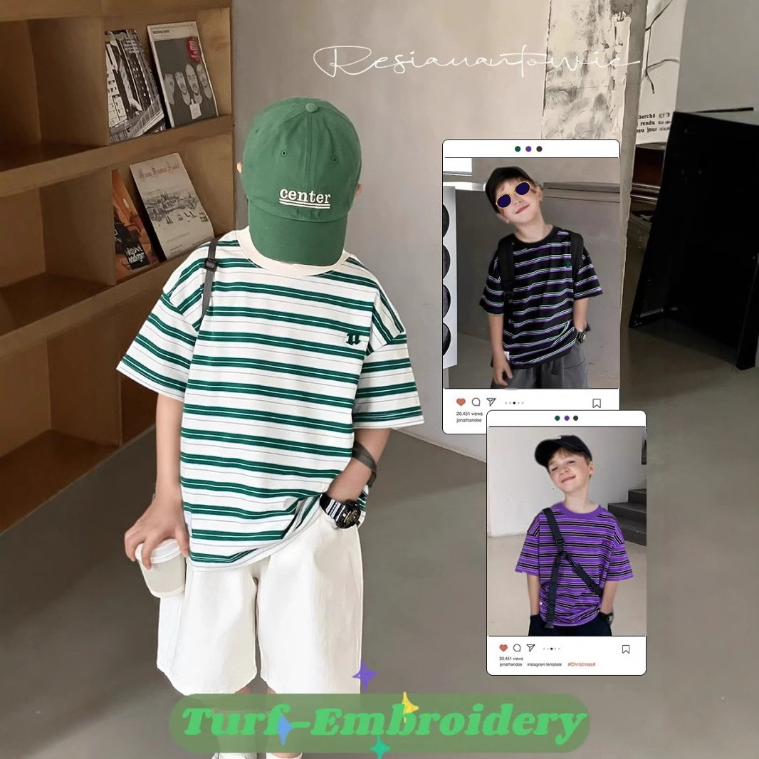 夏の韓系男の子半袖tシャツ2025新型子供純綿上着ゆったり韓範女の子半袖ストライプ