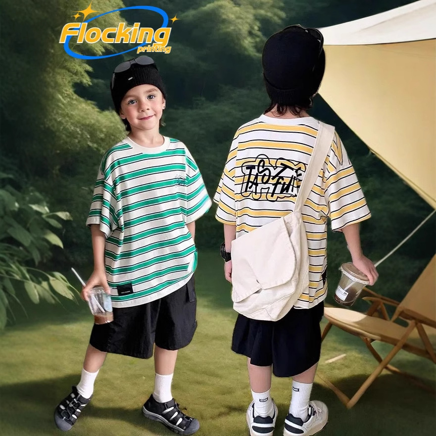 夏の新型韓国版百合中大童夏服ストライプ半袖tシャツ子供服2025男女子供ファッションクール上着