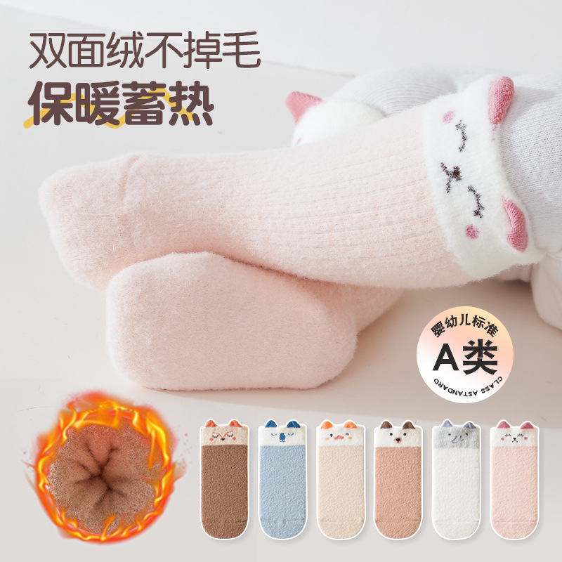 婴儿袜子冬季可爱加绒加厚保暖高弹拼色松口无骨男女童宝宝中筒袜