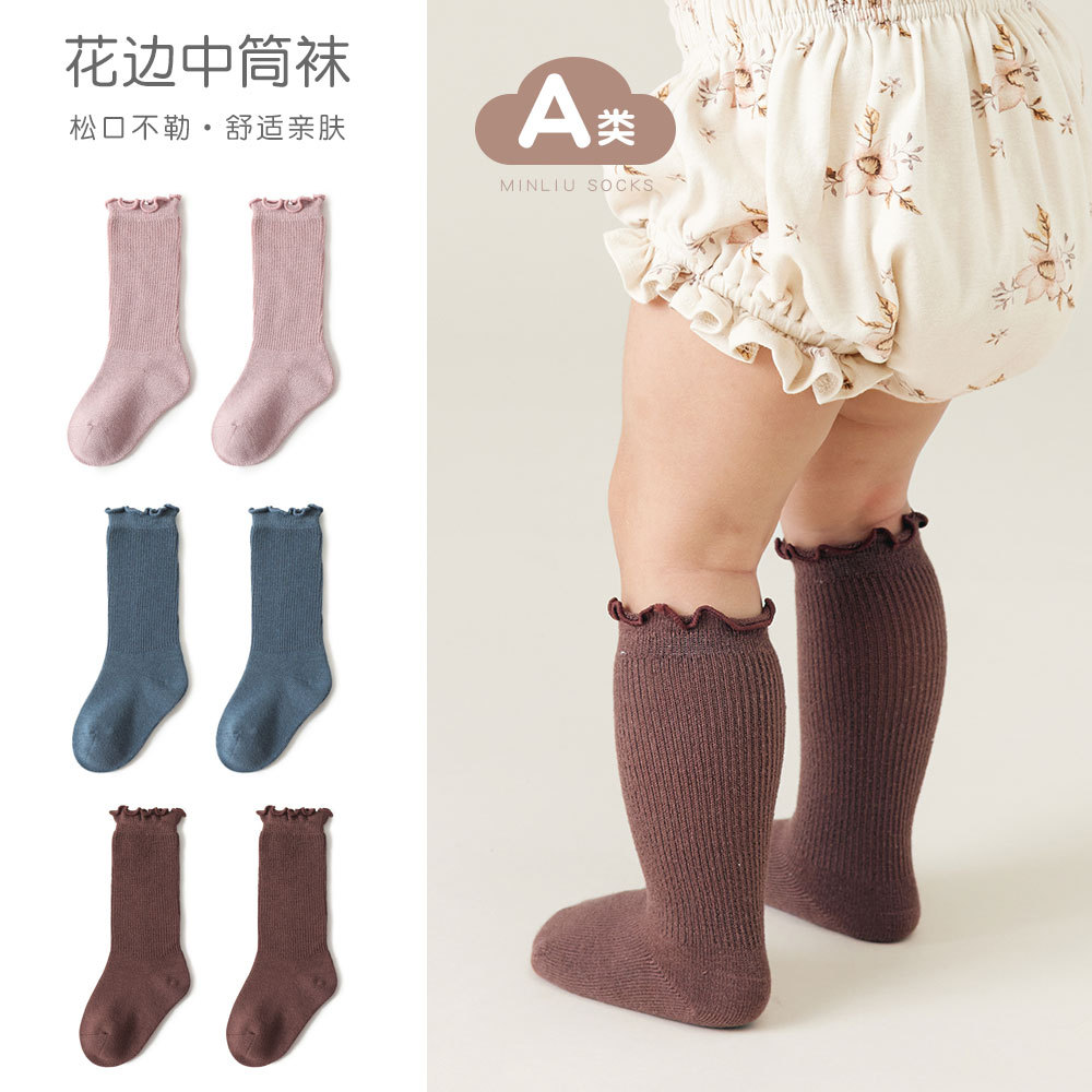 宝宝袜子无骨中筒袜蝴蝶结木耳边不勒腿韩版甜美公主袜纯色婴儿袜
