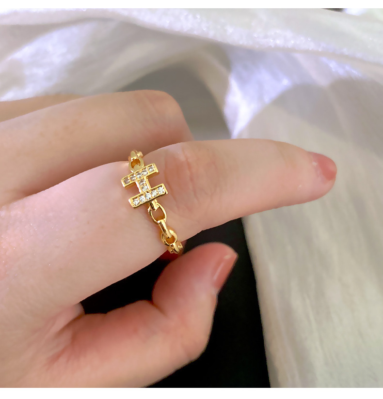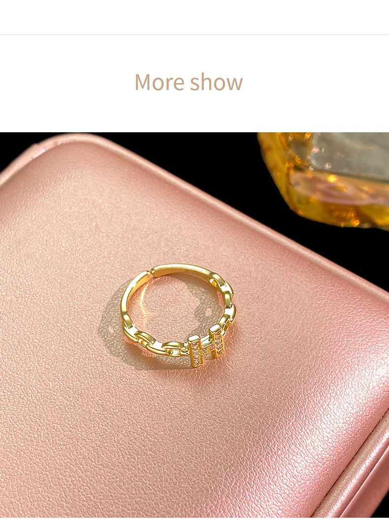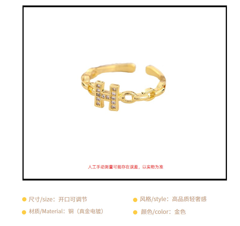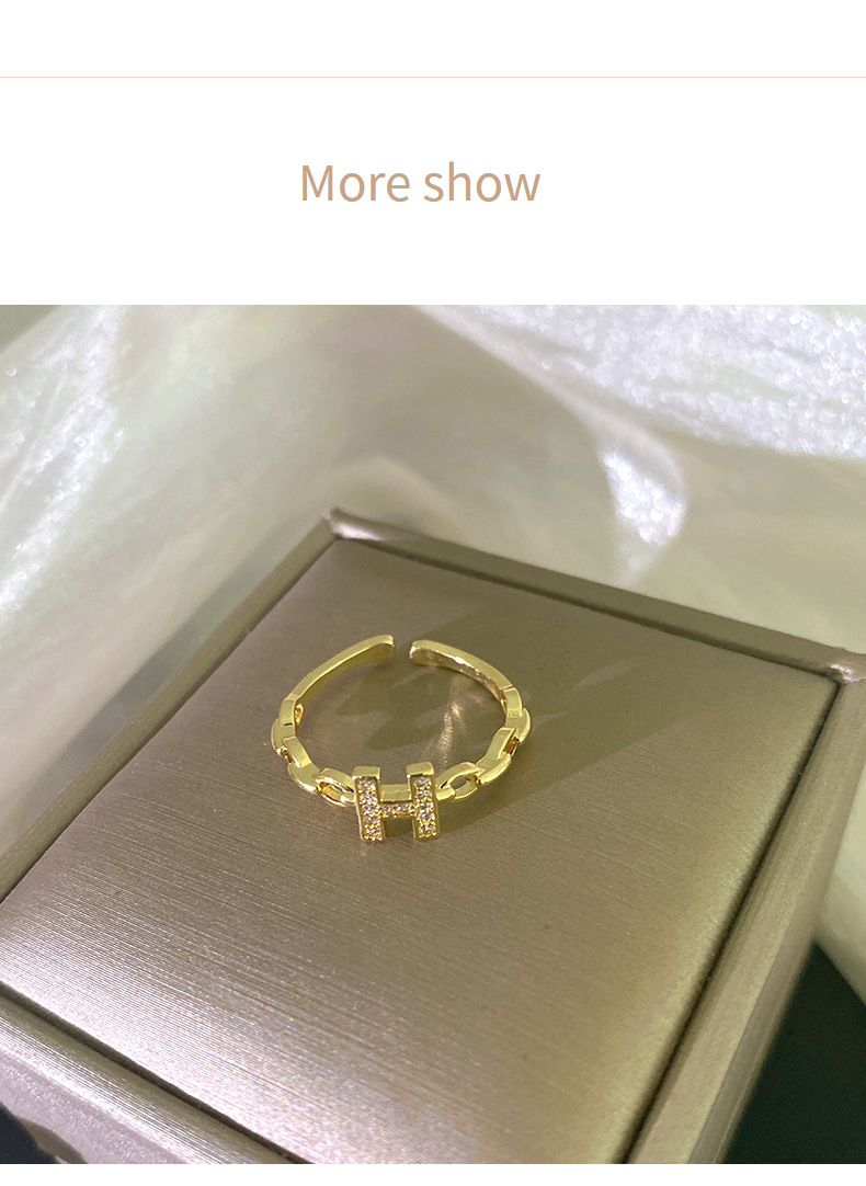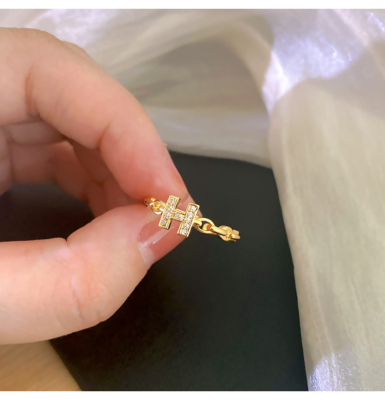 文字Hフルダイヤモンドリング レディース 銅製ジルコン象嵌 本金メッキ 高品質 オープンリング インターネットセレブ向け ライトラグジュアリーアクセサリー