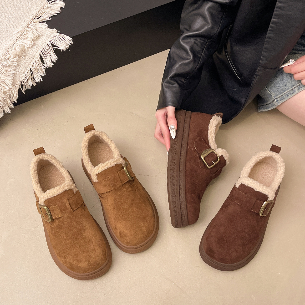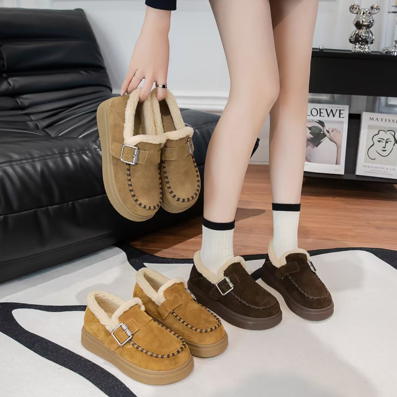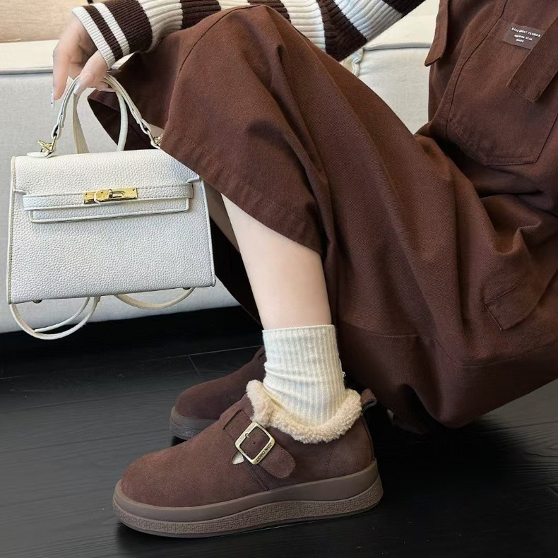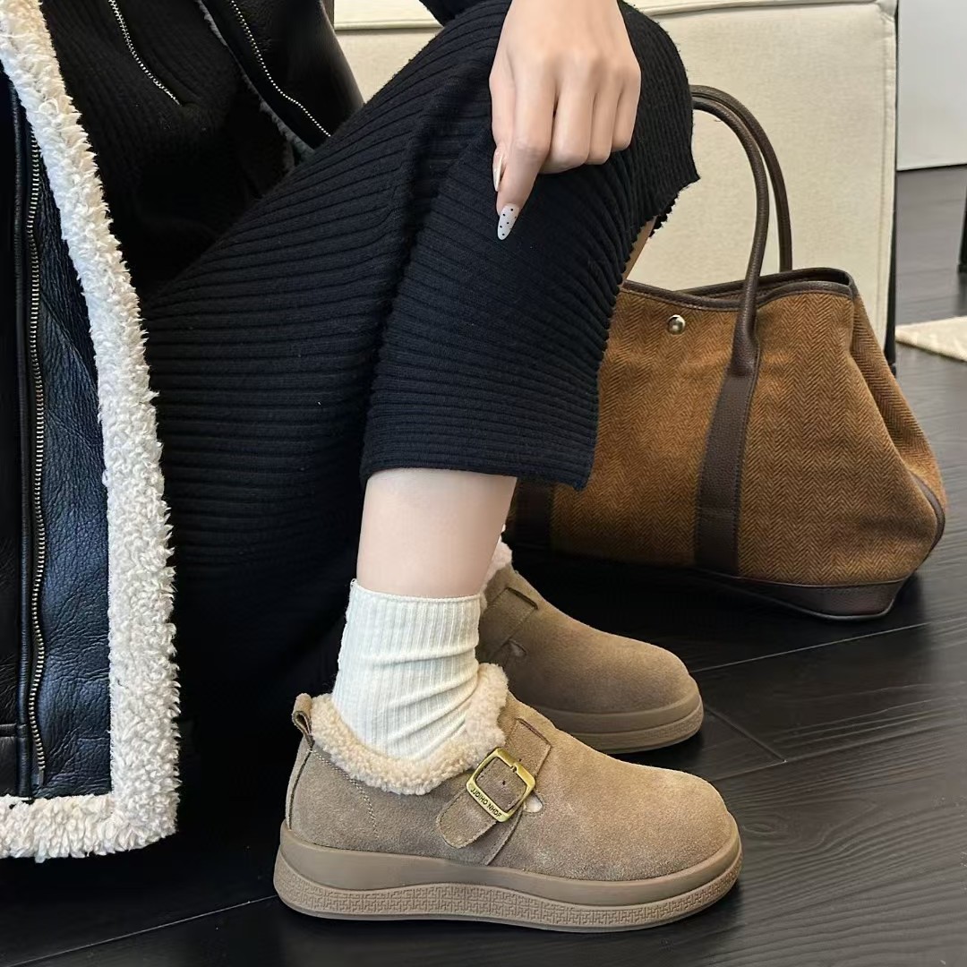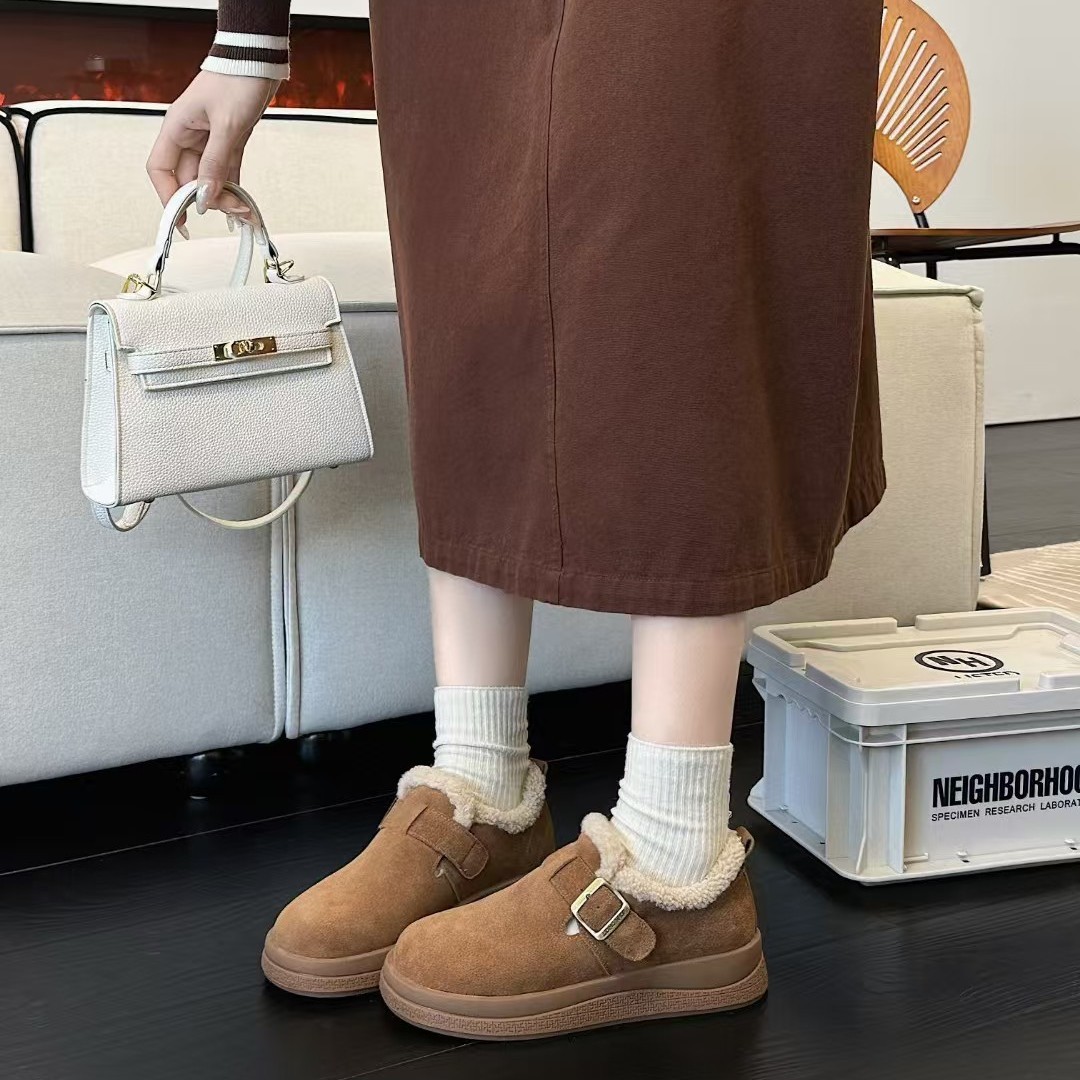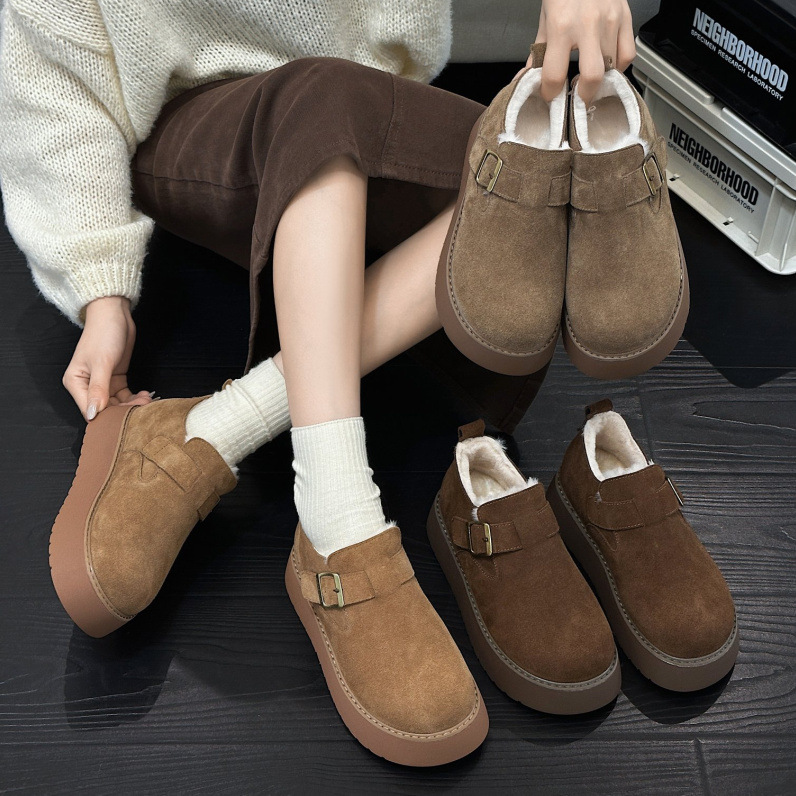 本革厚底ボーケンシューズ レディース 2025秋冬新作 裏起毛レディースシューズ 暖かいファーシューズ 万能カジュアルシューズ 綿靴