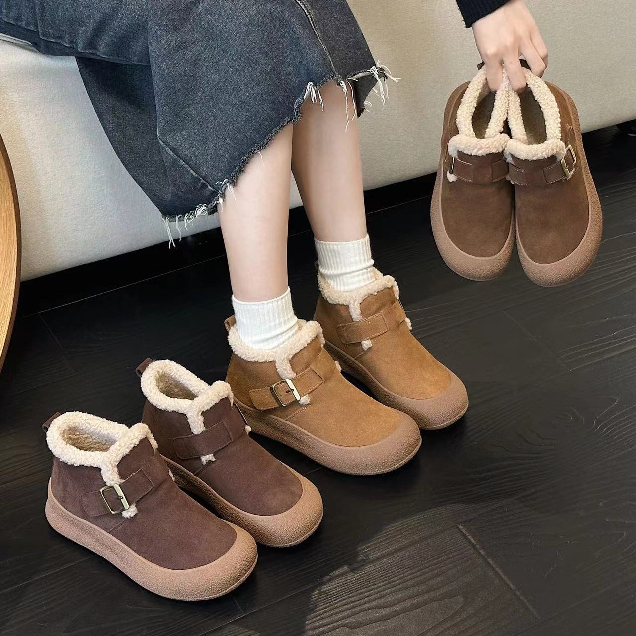 本革とフリースのブーツ型サンダル レディース 2025秋冬新作 スリッポン モコモコシューズ 快適なソフトソール カジュアルコットンシューズ