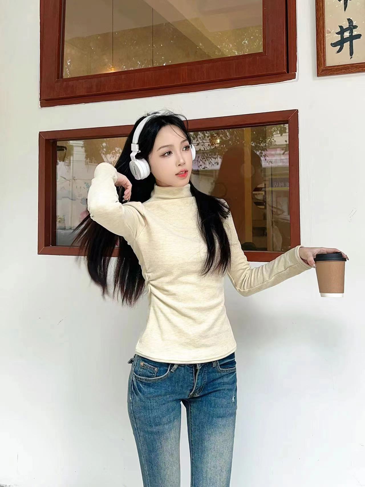 秋冬半高领新款加绒褶皱修身上衣内搭磨毛发热恒温螺纹打底衫女