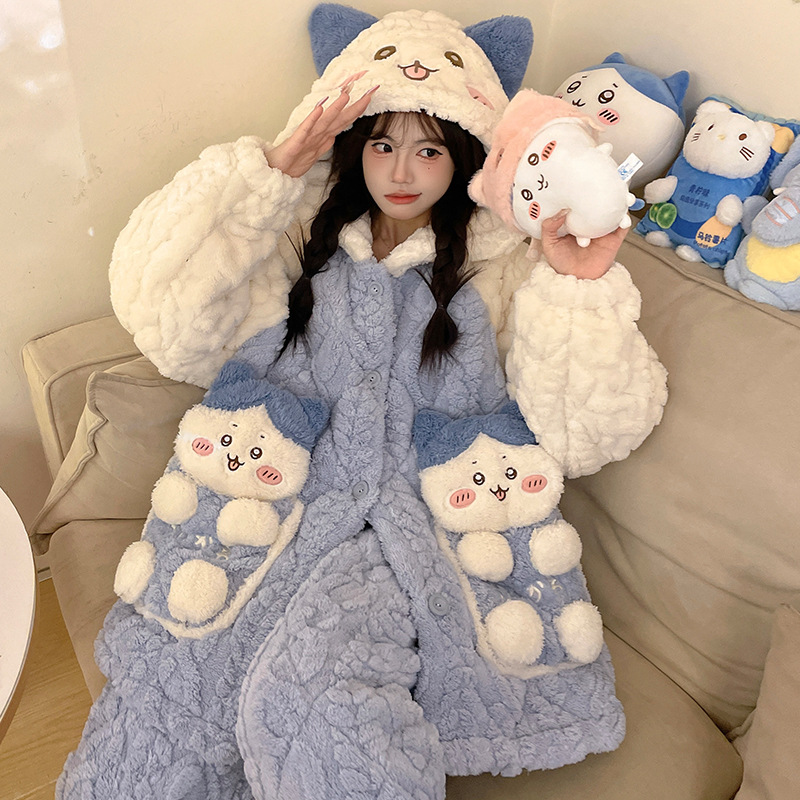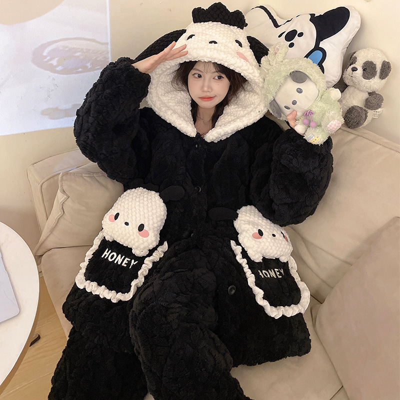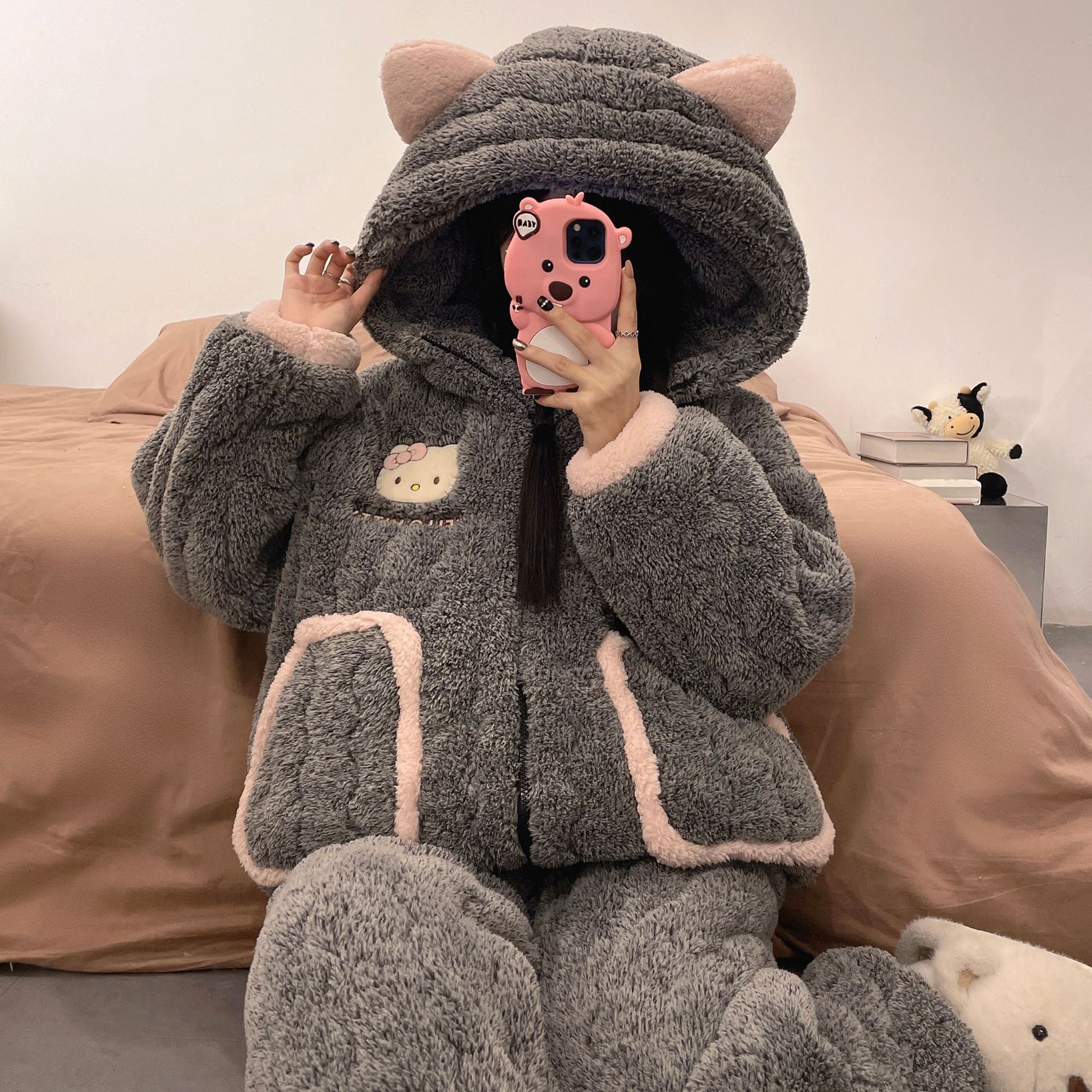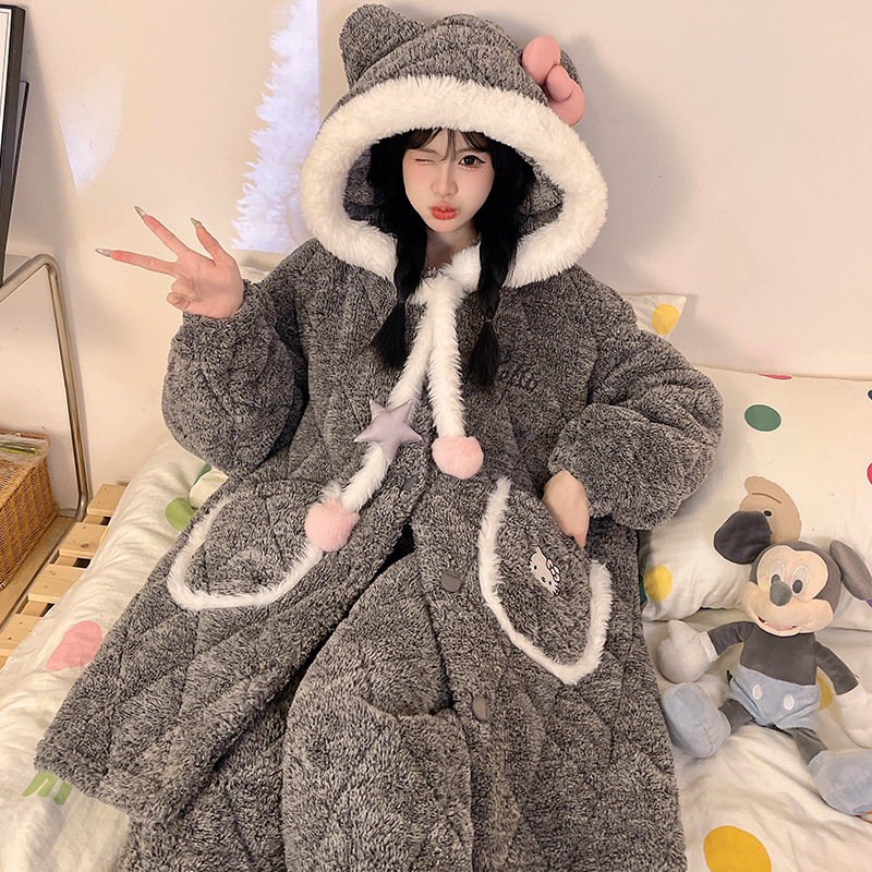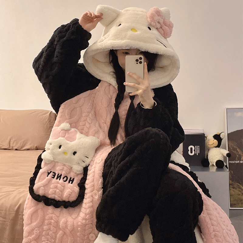 珊瑚绒睡袍长款冬季加绒加厚可爱hellokitty睡衣女连帽家居服套装