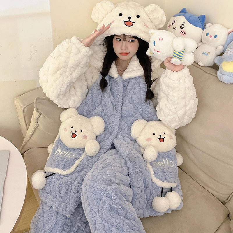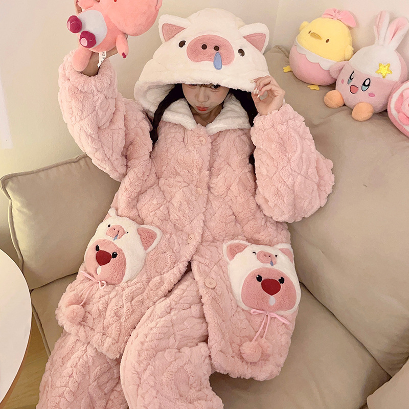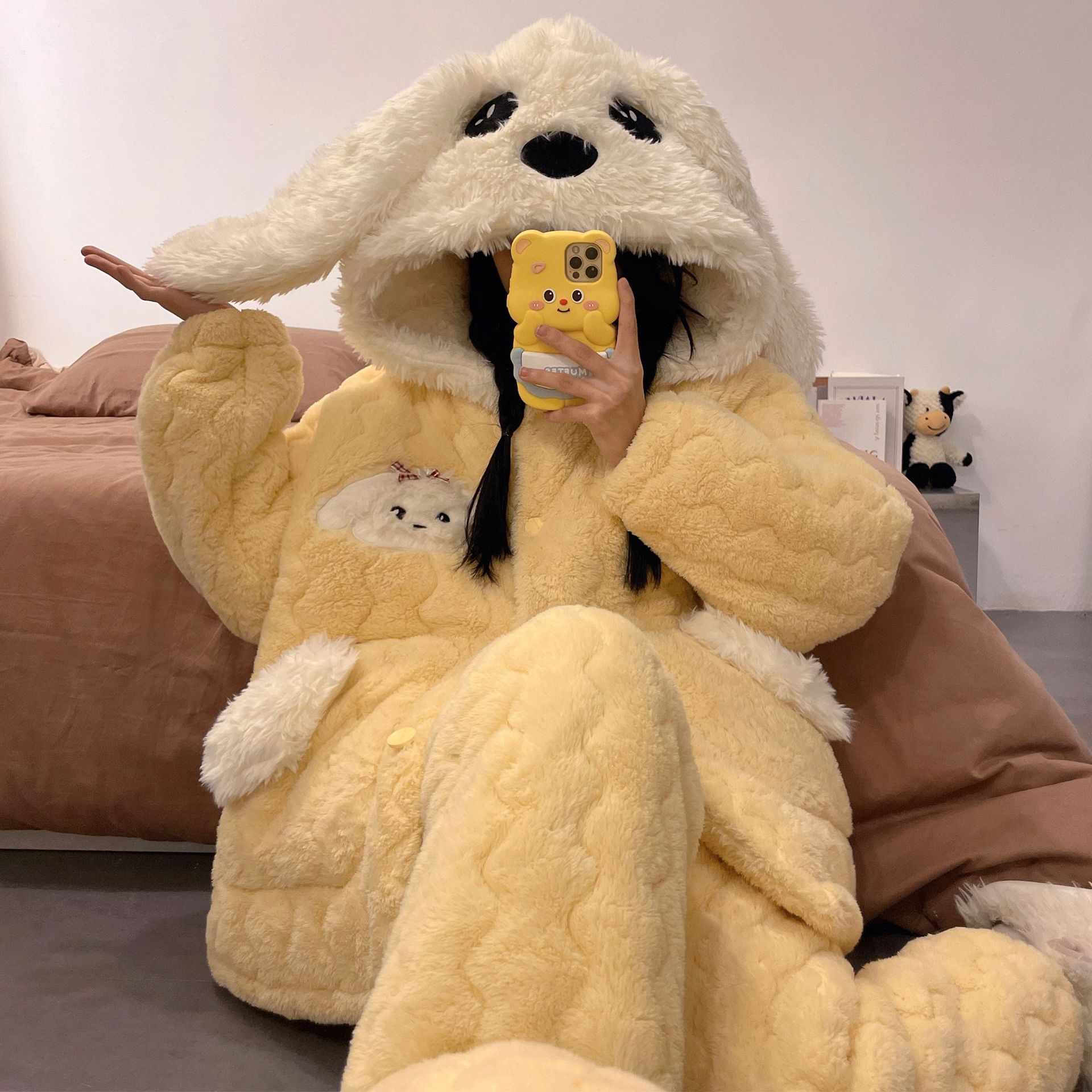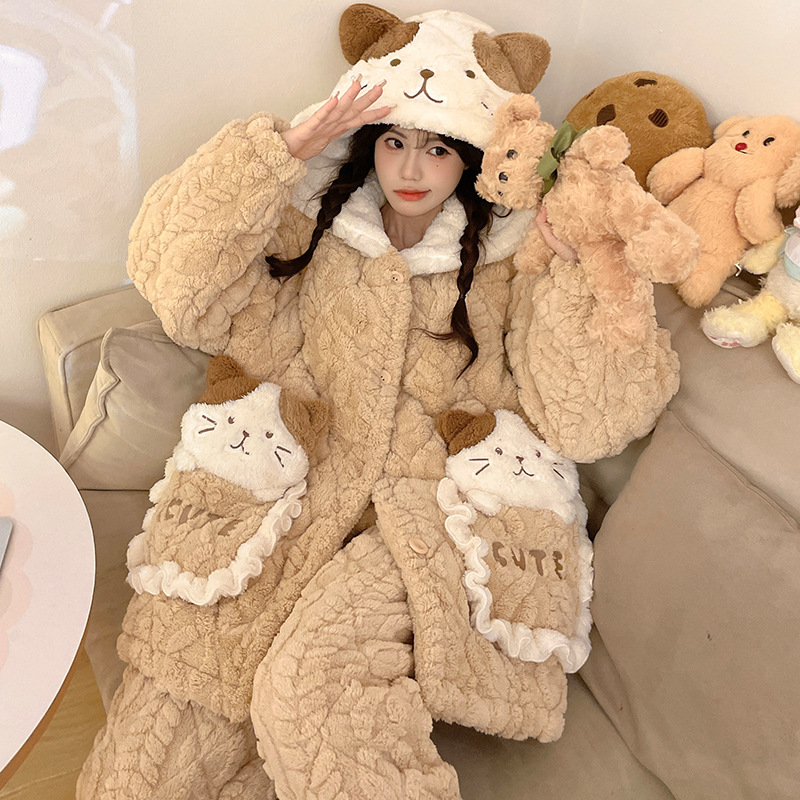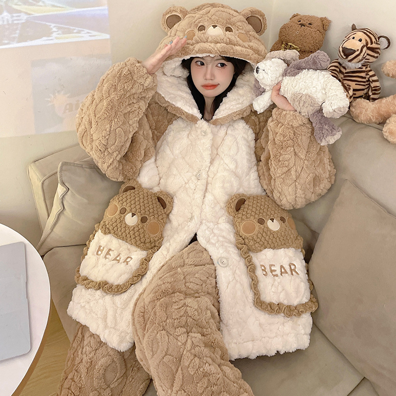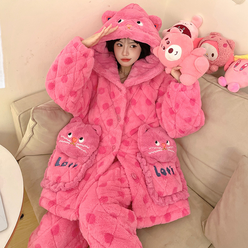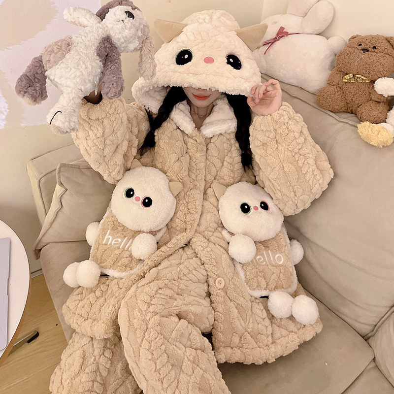冬季三层夹棉夹棉睡衣女款保暖加厚省服珊瑚绒卡通可爱连帽家居服
