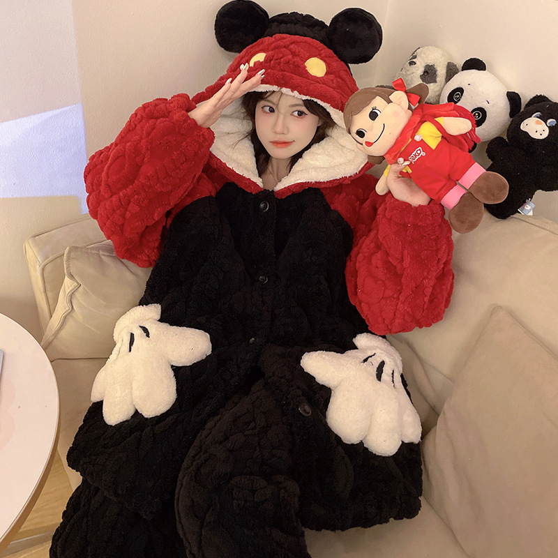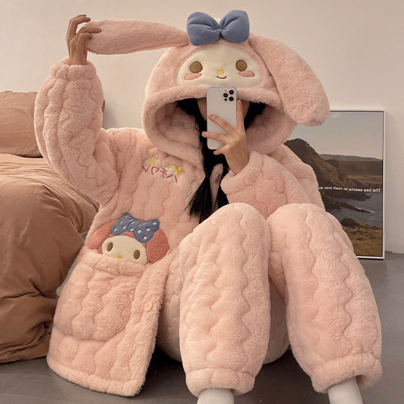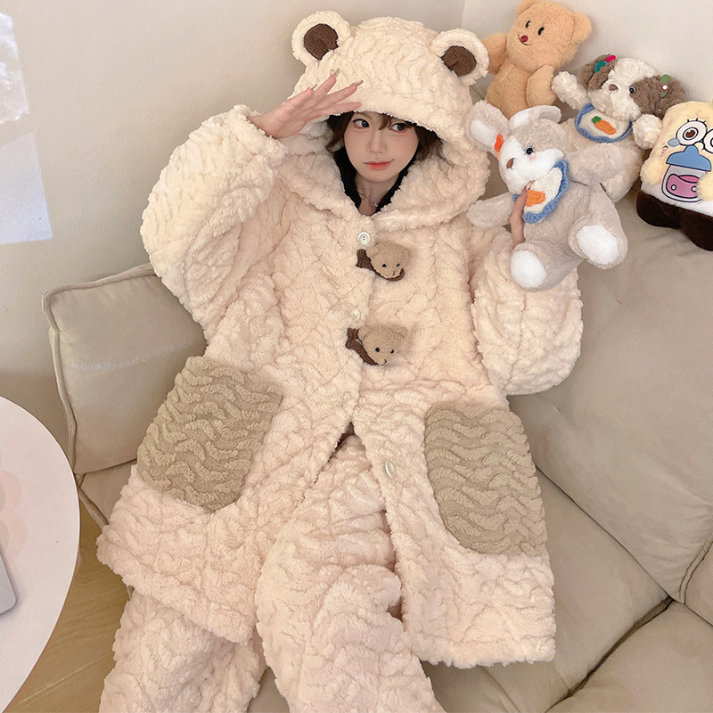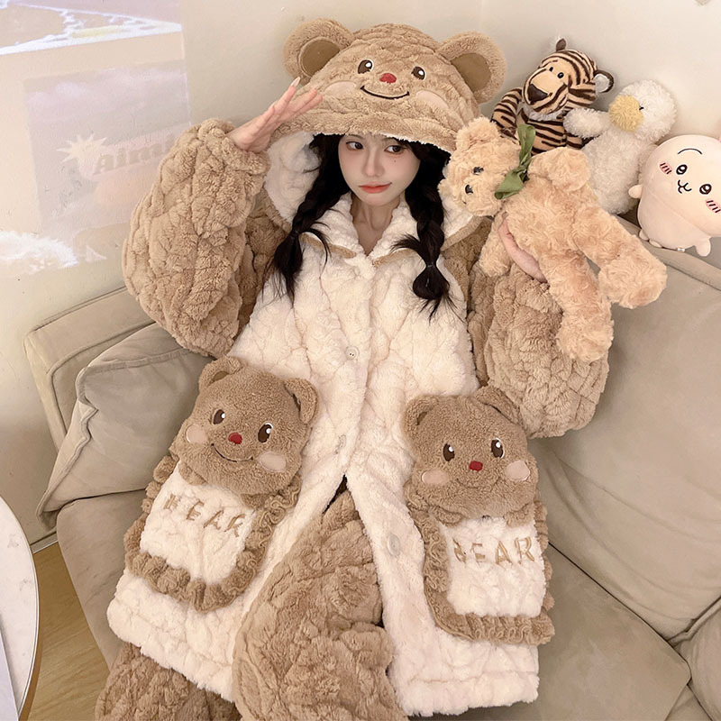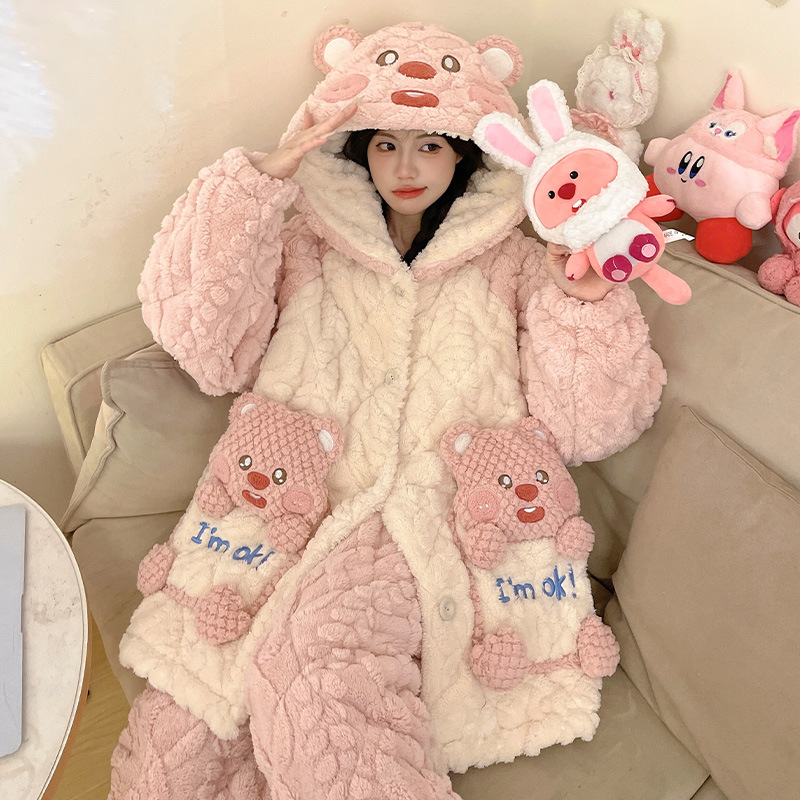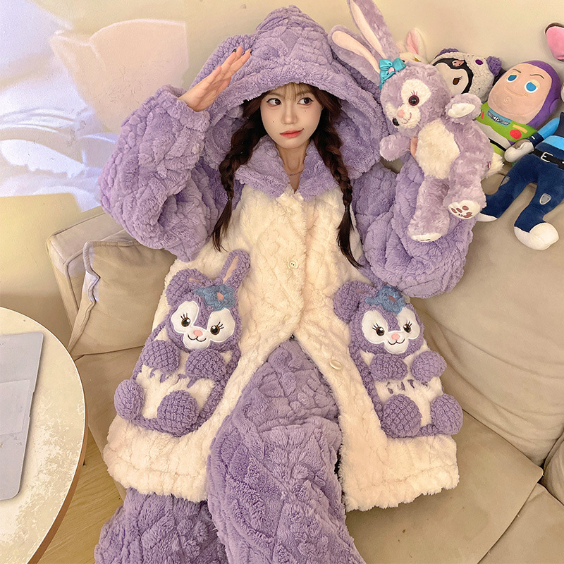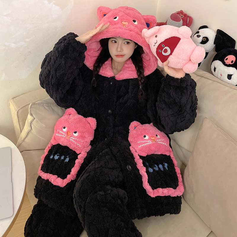 冬季三层夹棉夹棉睡衣女款保暖加厚省服珊瑚绒卡通可爱连帽家居服
