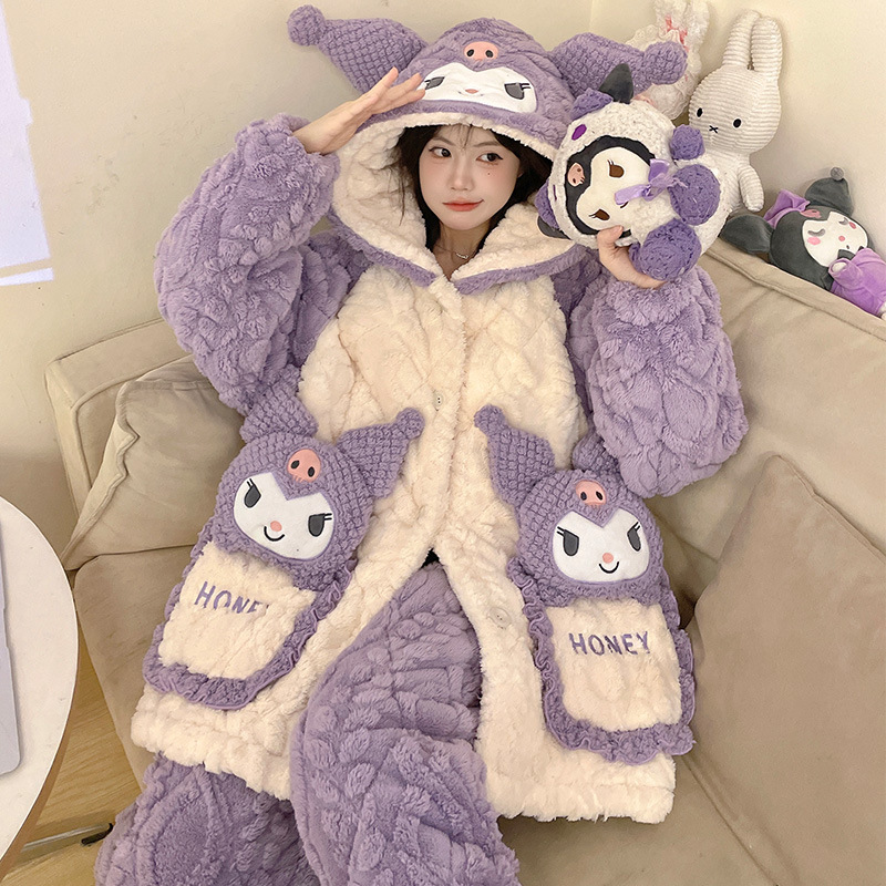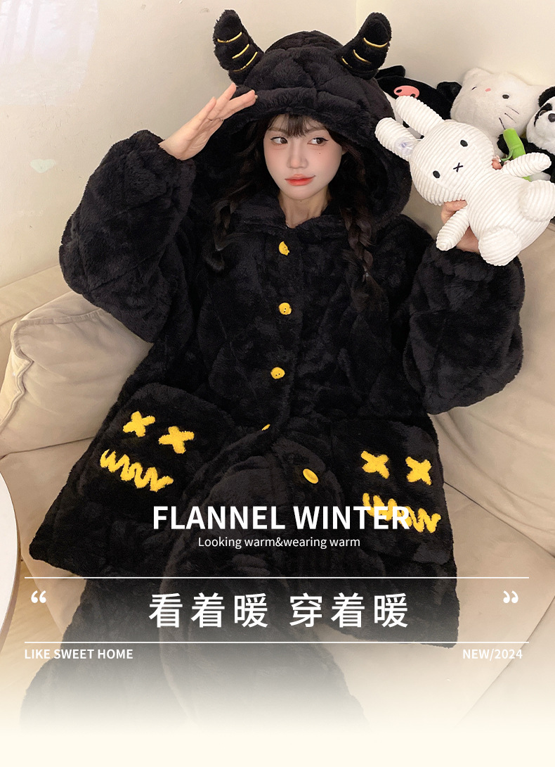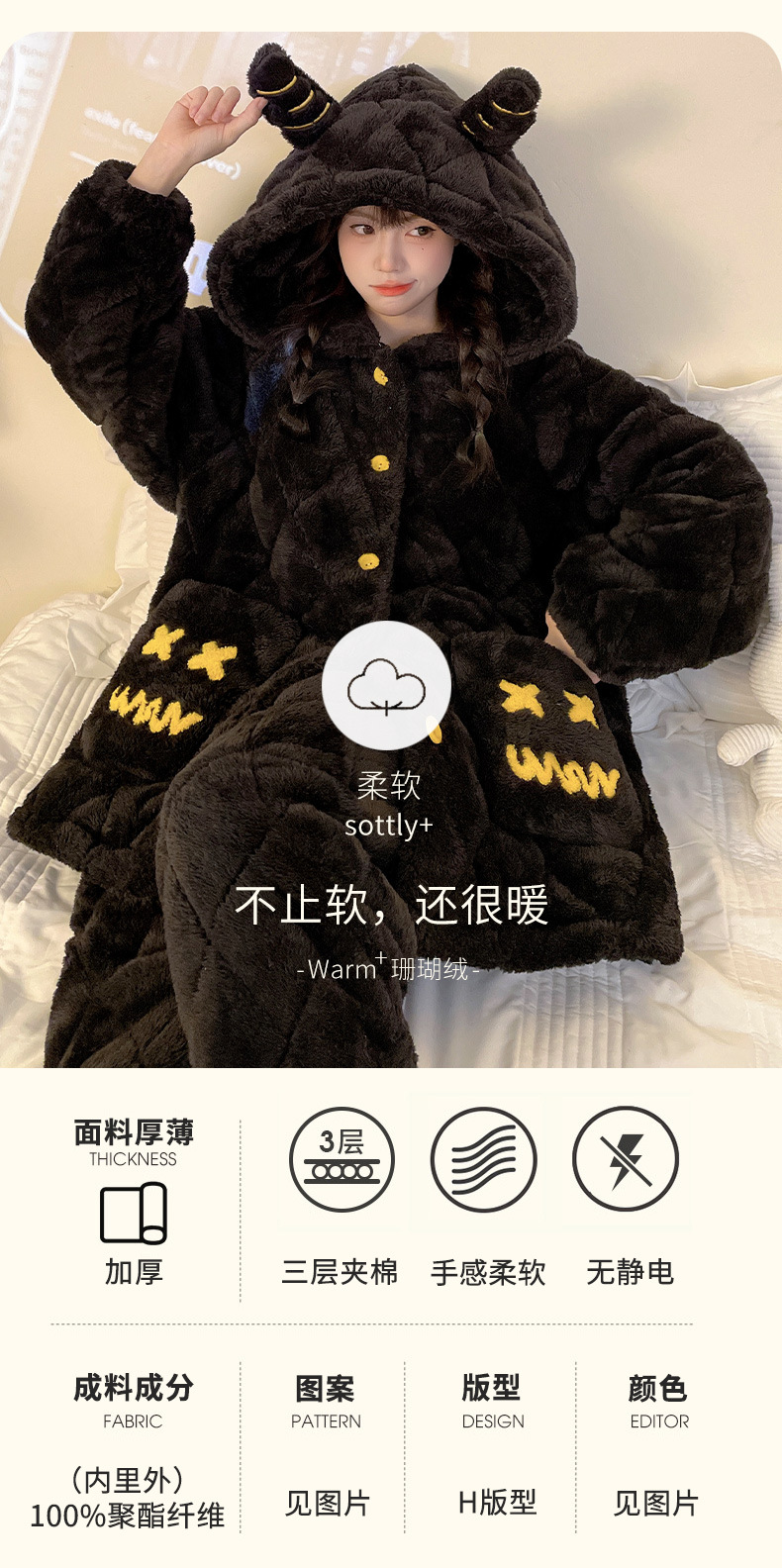 睡衣女冬季加绒加厚珊瑚绒三层夹棉袄保暖睡袍卡通家居服套装冬天