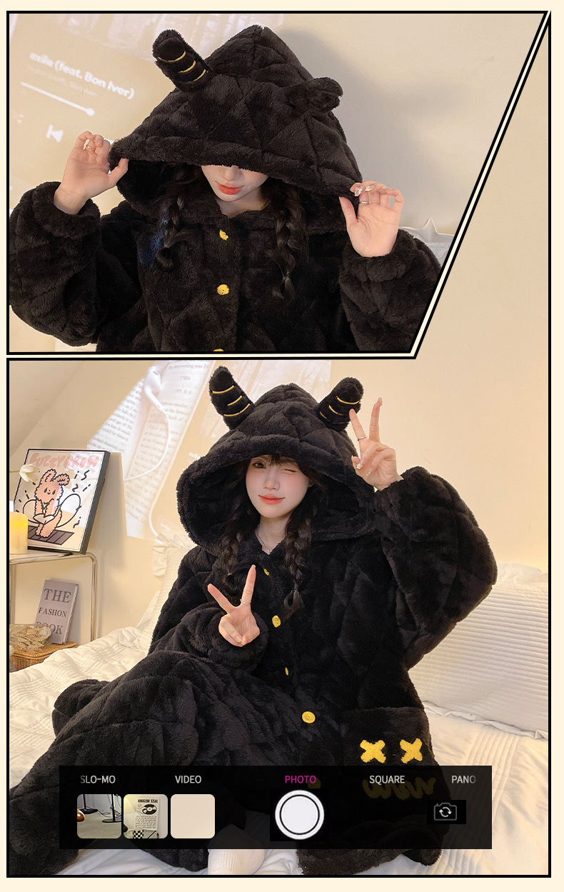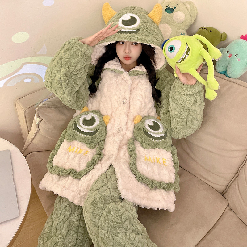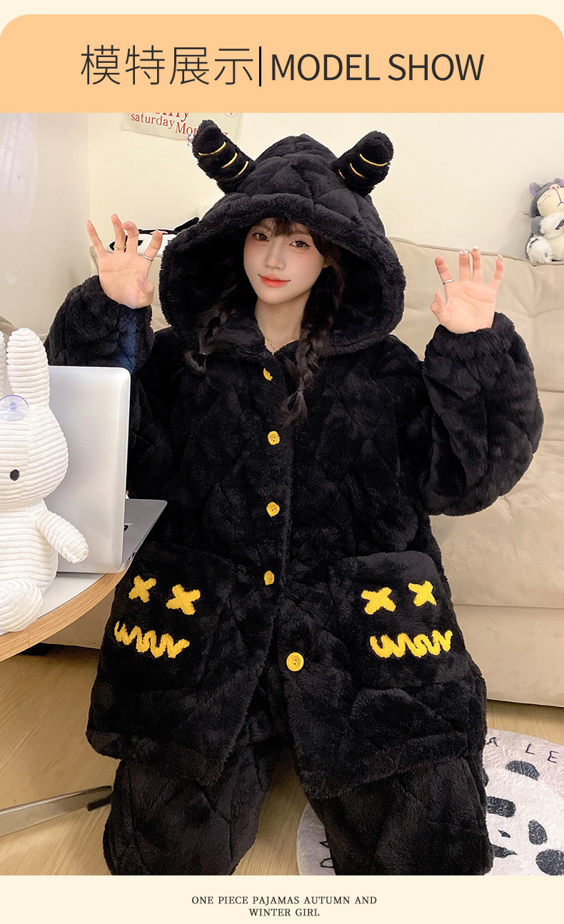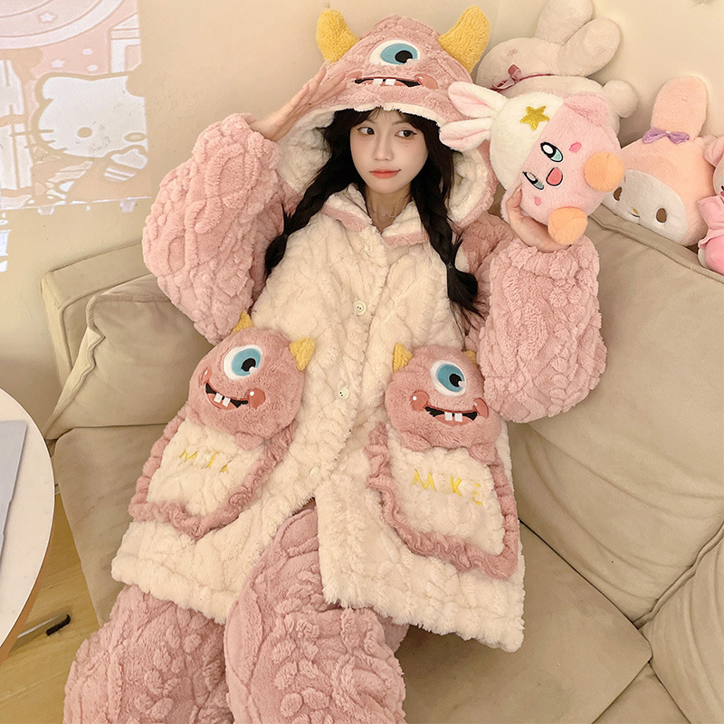 かわいいモンスターのパジャマの女性は冬にベルベットを厚くして、ベルベットのパジャマの冬の帽子の家の服を着ています