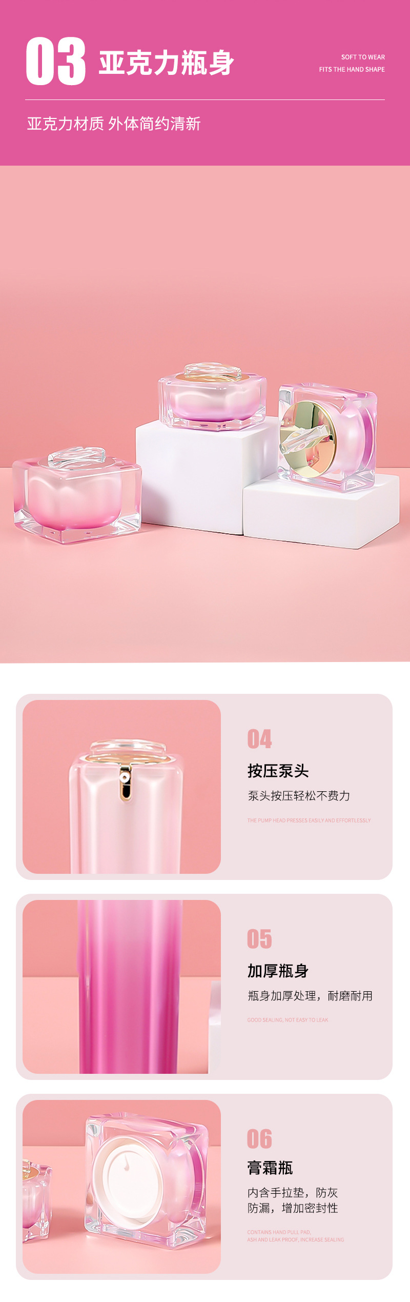 15/30/50gクリームボトル、30/60/100mlアクリル製乳液ボトルセット(トップピース付き)の卸売供給