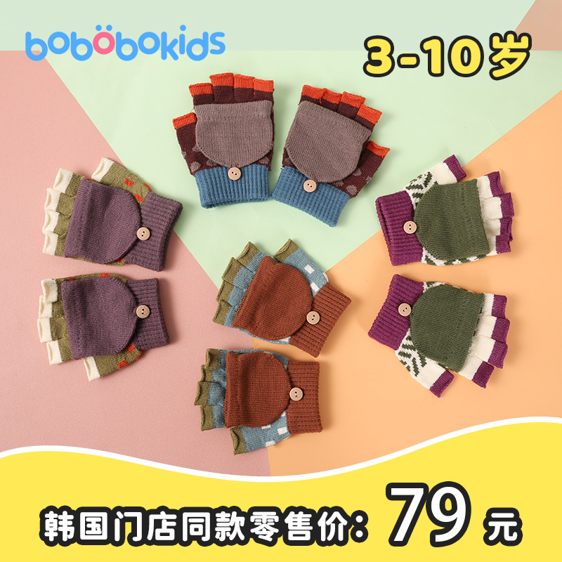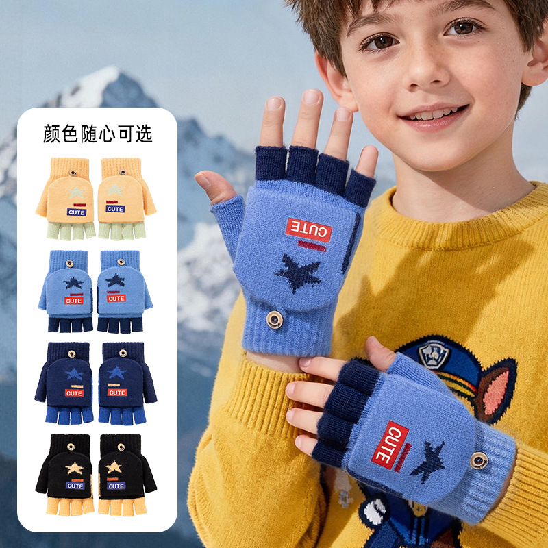 儿童手套冬季保暖男童针织翻盖宝宝半指中大童写作业卡通幼儿园