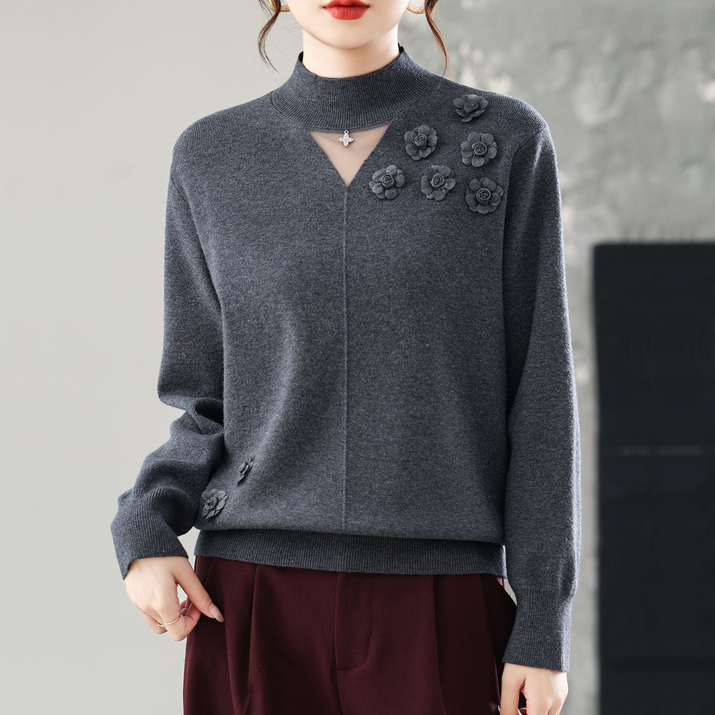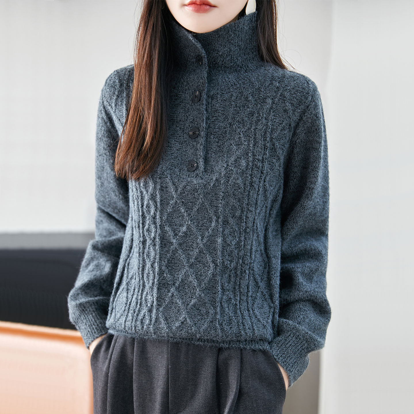 【一線成衣】高襟の純色がやせて見えるニットセーターを積んでいます。