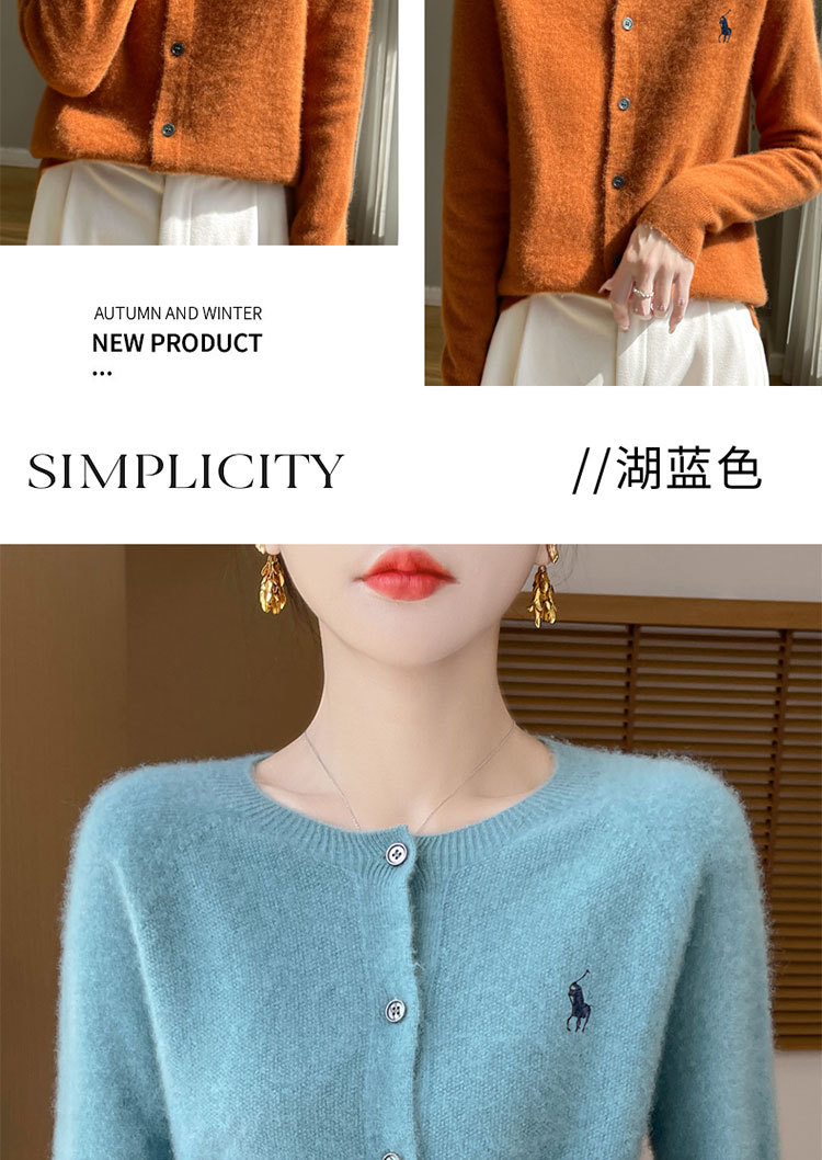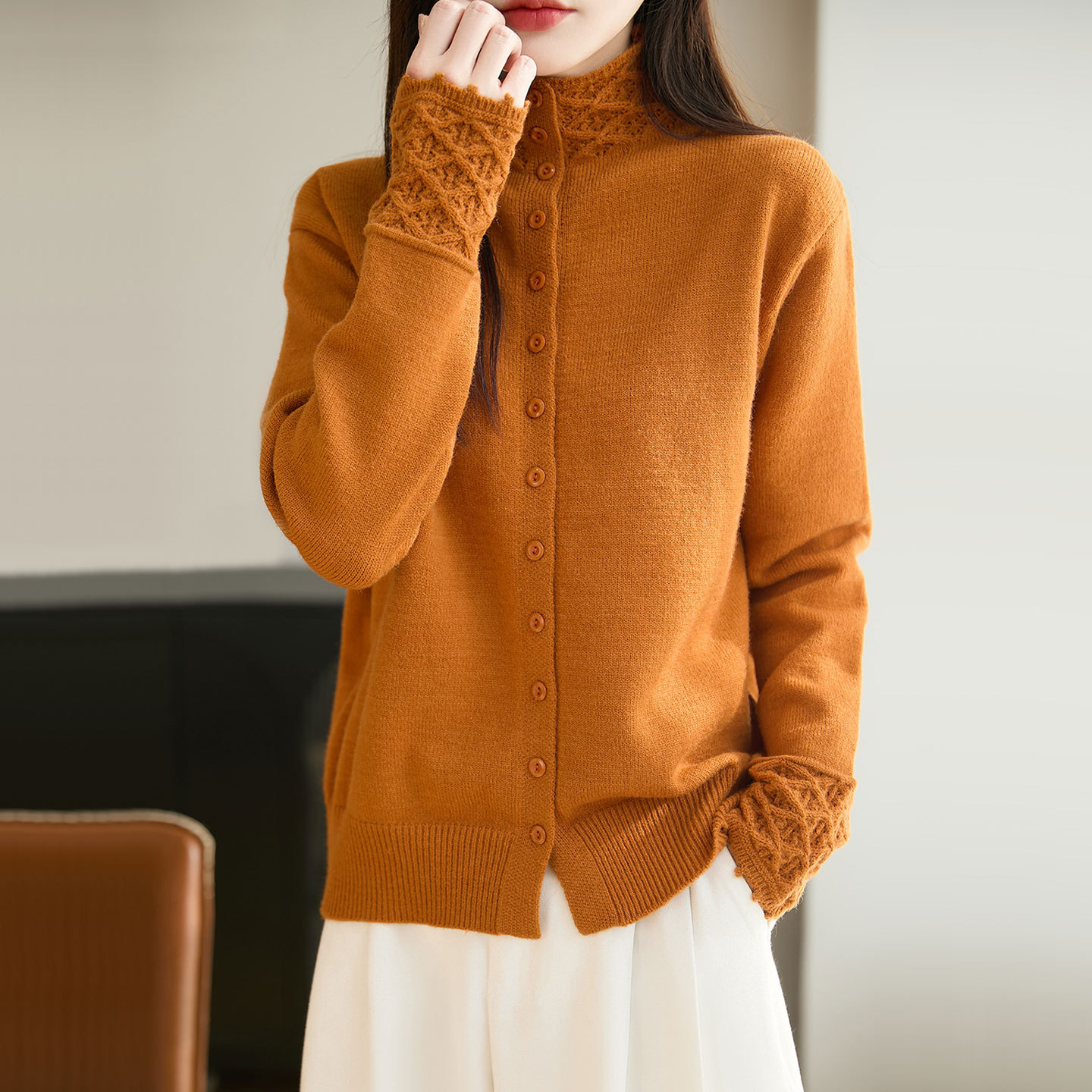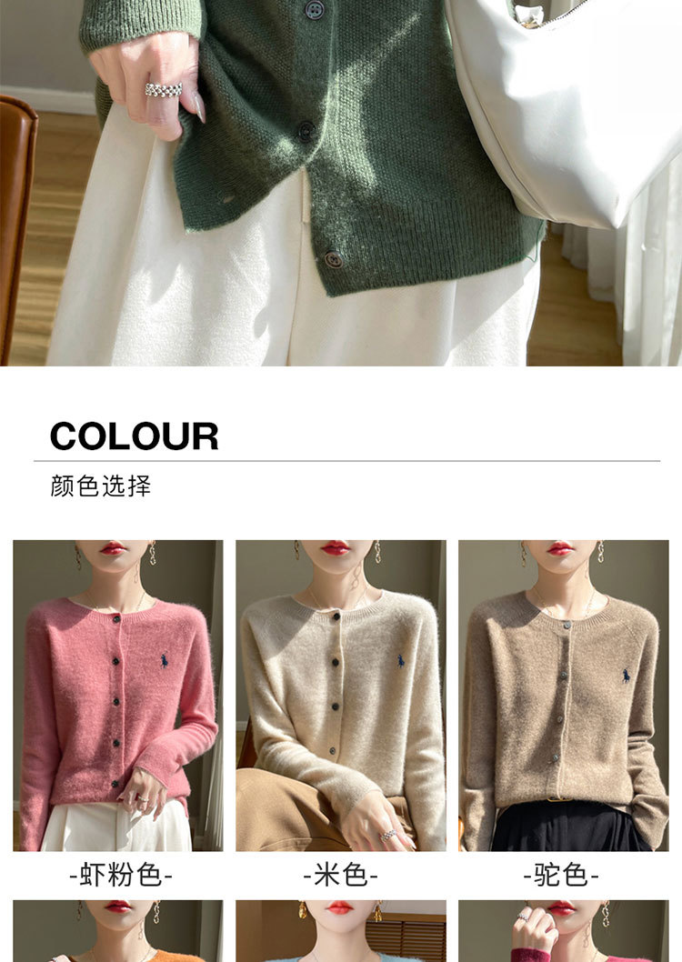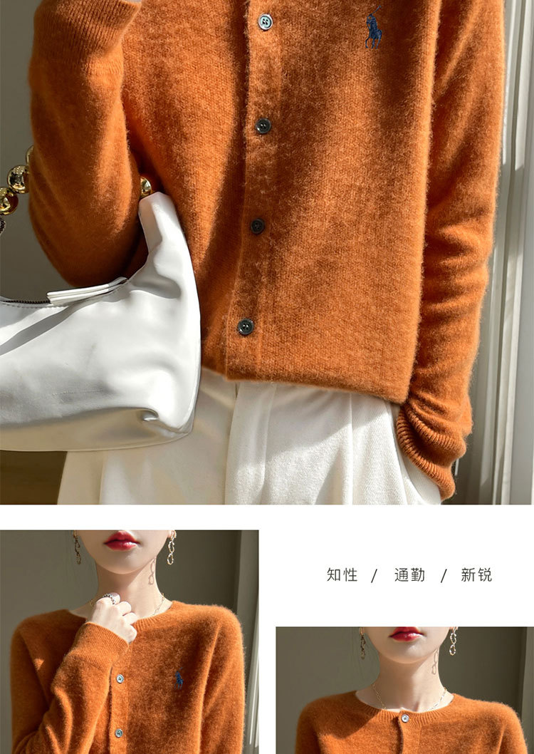【メーカー直供】襟をめくってニットのカーディガンを着ます。