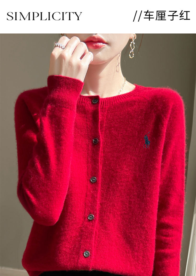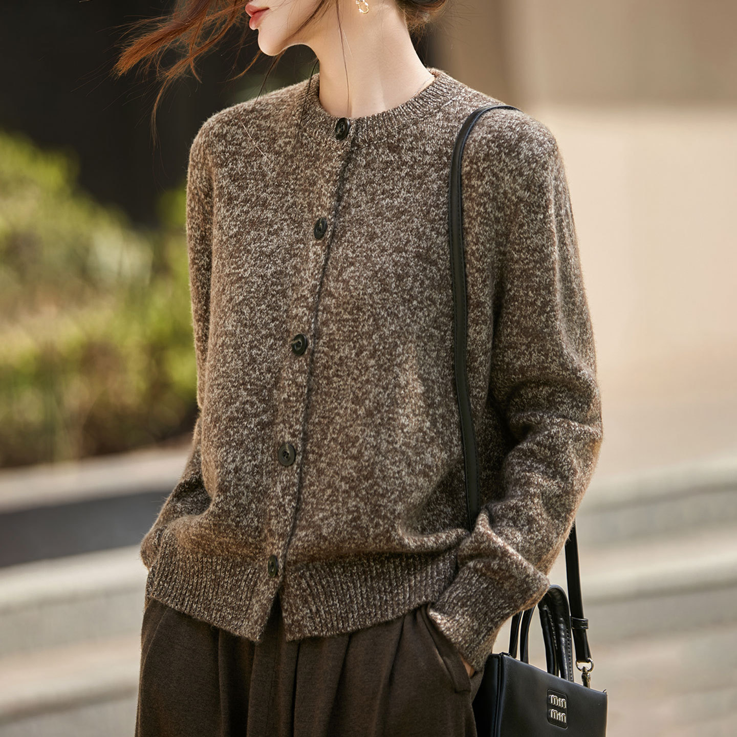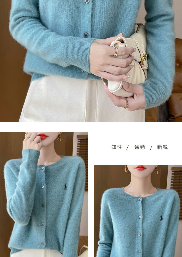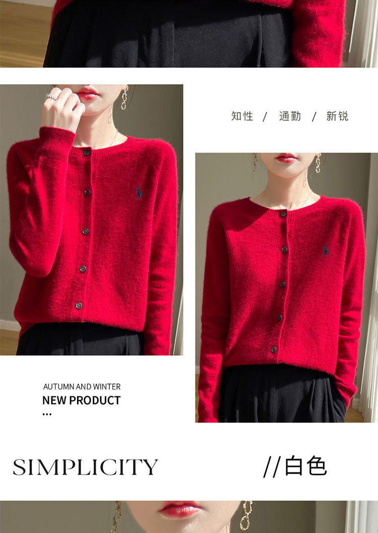 【メーカー直供】襟をめくってニットのカーディガンを着ます。
