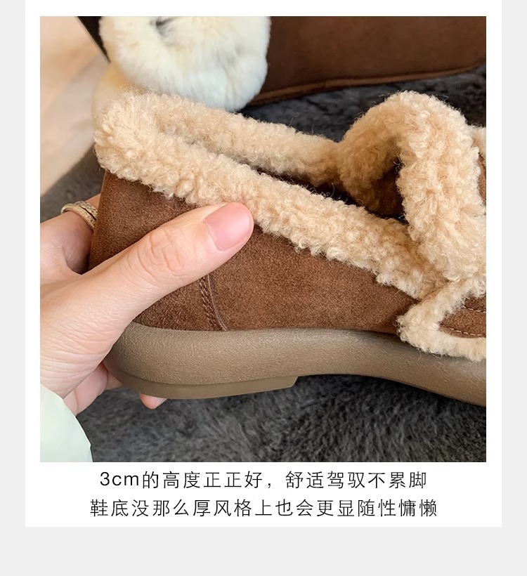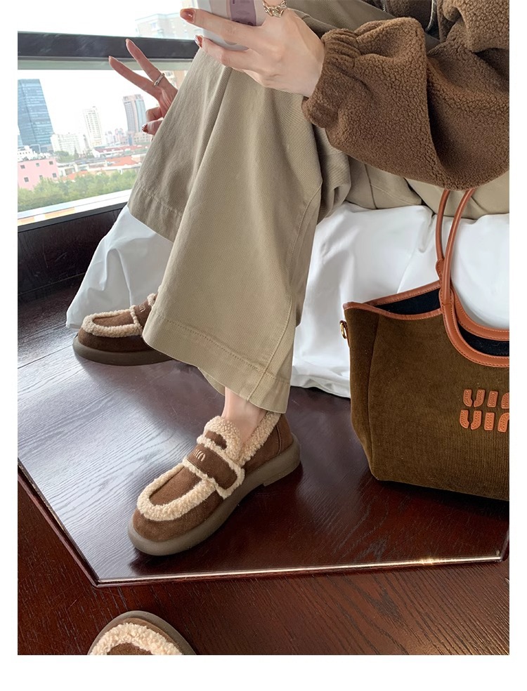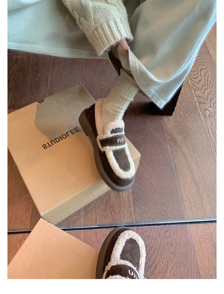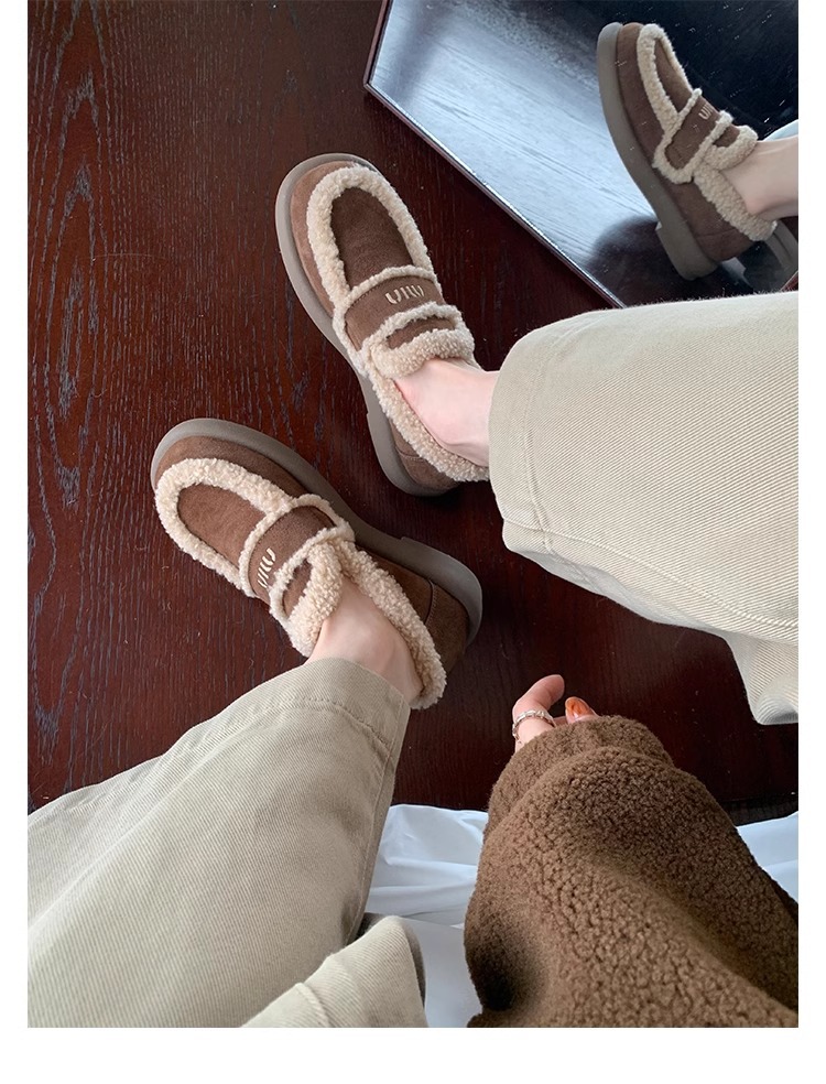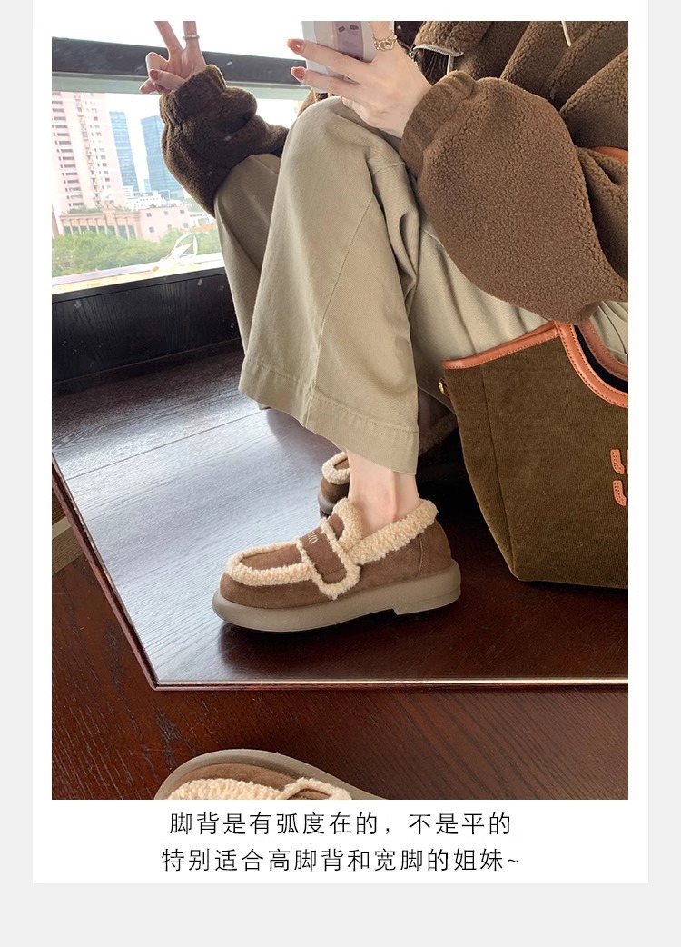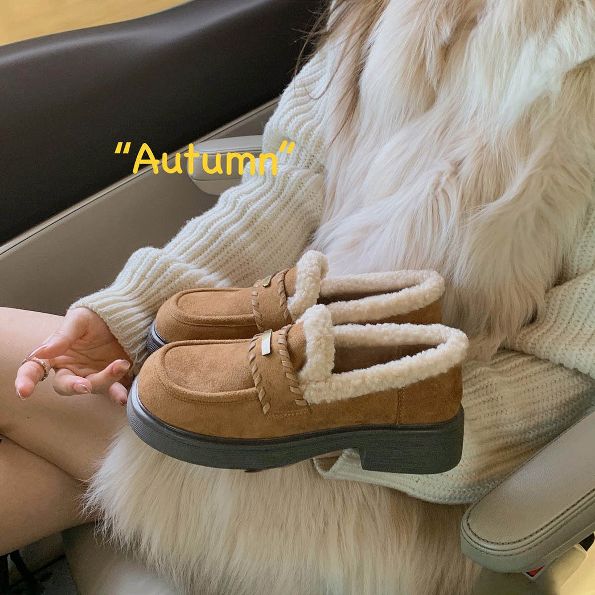 丸頭スエード暖かいスリッポンシューズ、アミウ、厚底、裏起毛、厚手の綿靴、毛皮ローファー、女性用