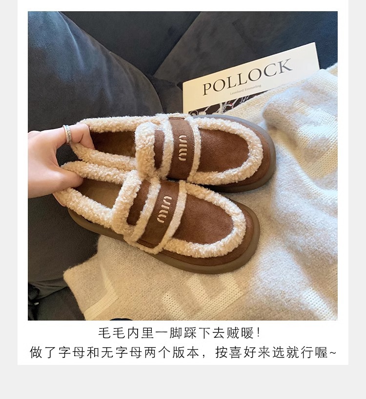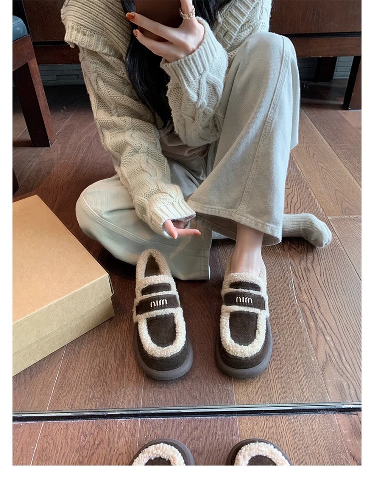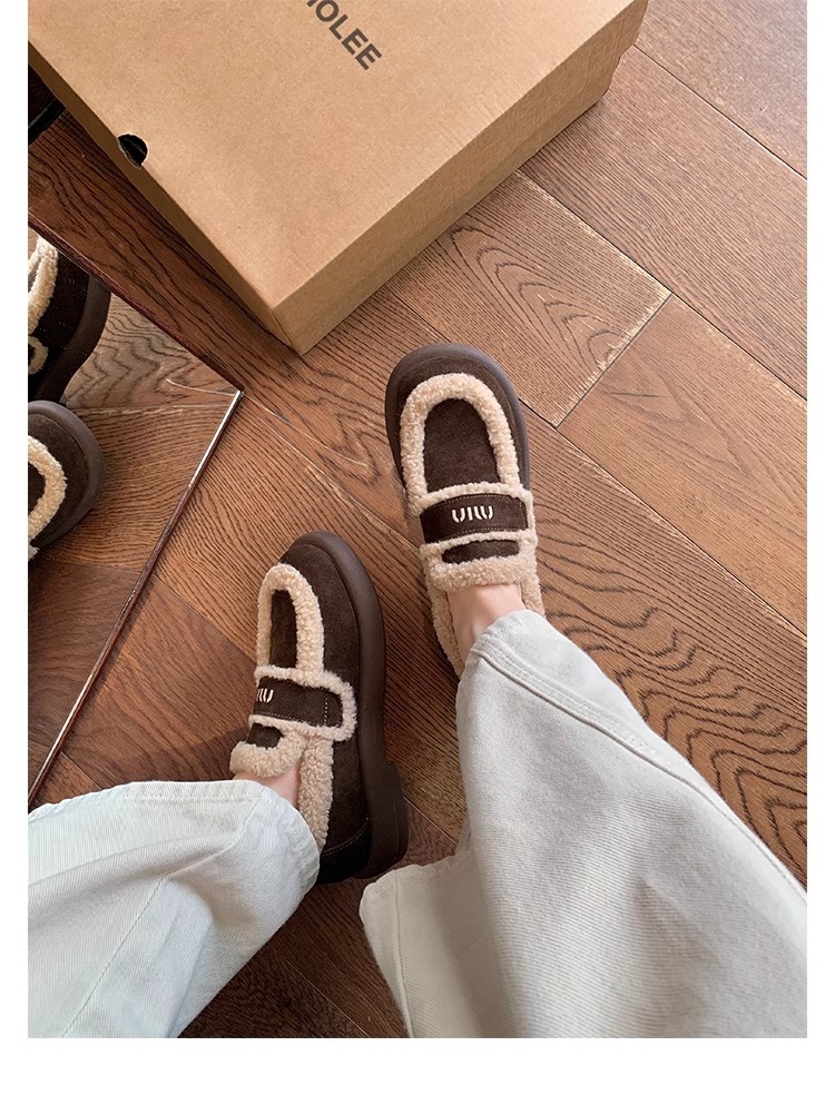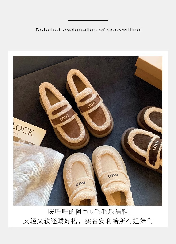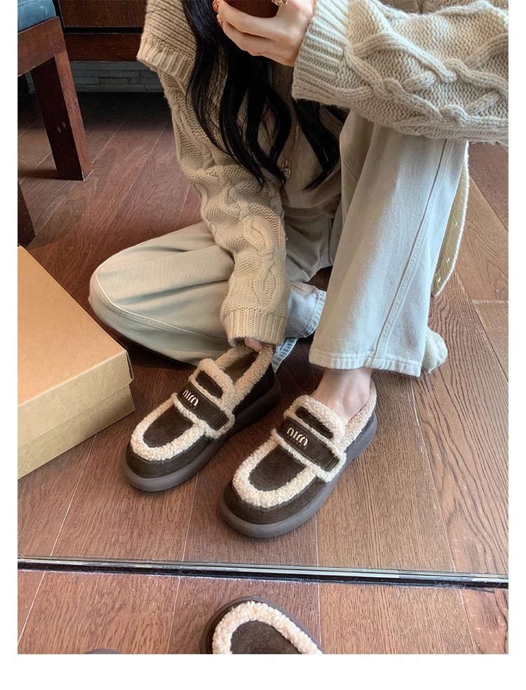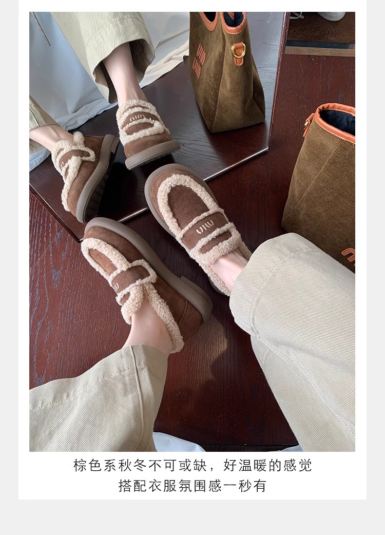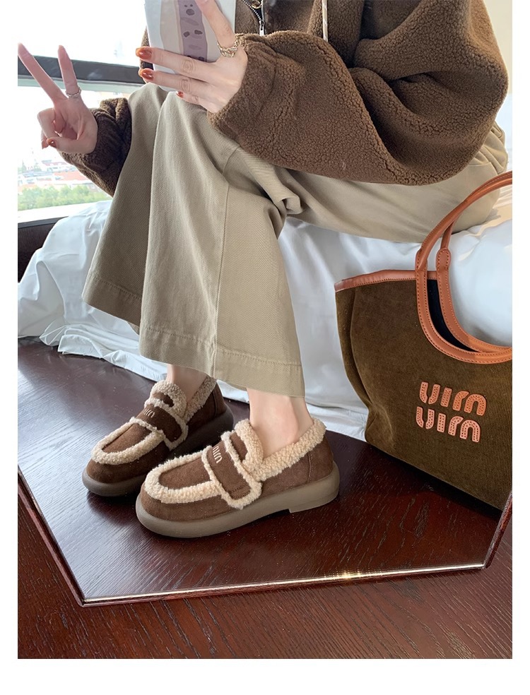 丸頭スエード暖かいスリッポンシューズ、アミウ、厚底、裏起毛、厚手の綿靴、毛皮ローファー、女性用