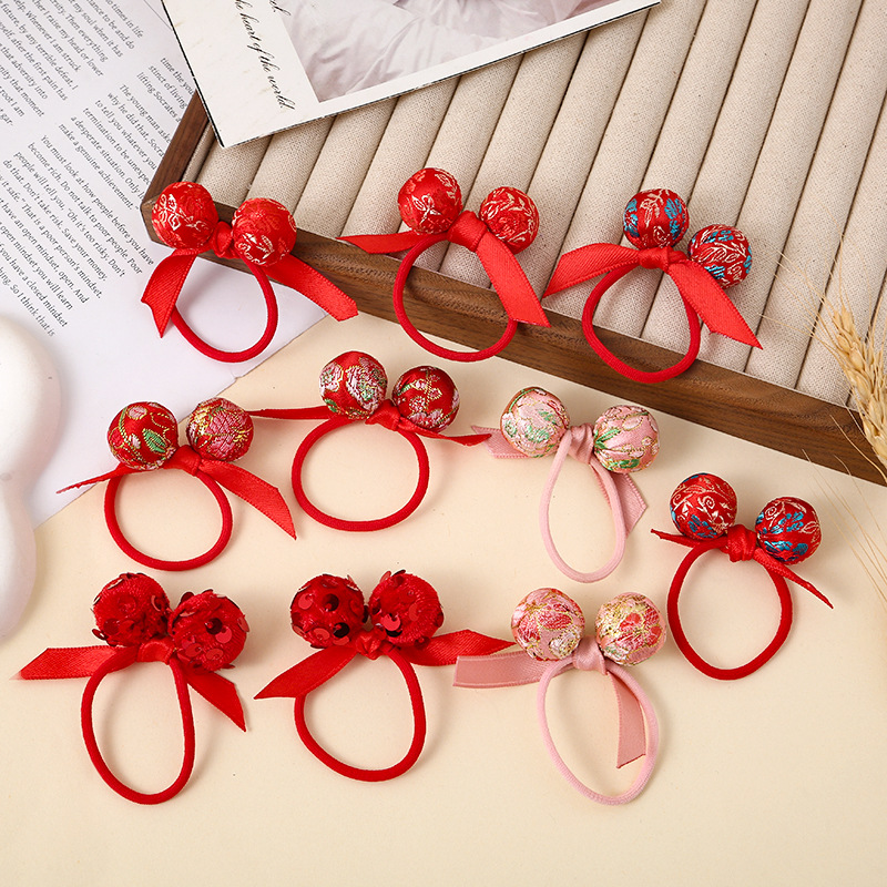 卸売りの赤い新年のサテンのとげは子供の少女の髪の輪の中国風の髪のひものお祝いの団子の髪のひもを詰めます。