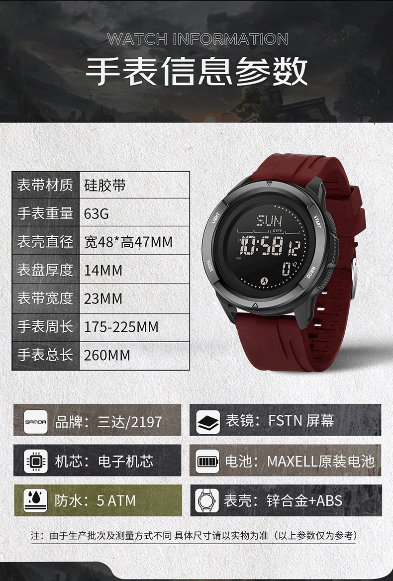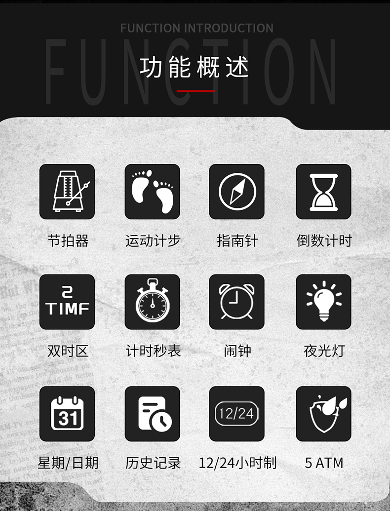 特別な機能 メトロノーム、スポーツ歩数計、コンパス、カウントダウン、デュアルタイムゾーン、履歴記録、ストップウォッチタイミング、目覚まし時計、曜日、夜光、防水