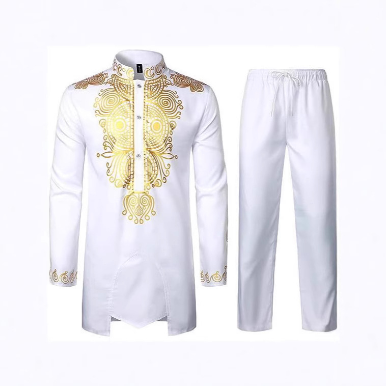 クロスボーダー熱売四季通用男性スーツ立襟箔押し上着ズボン2点セットアフリカスタイル