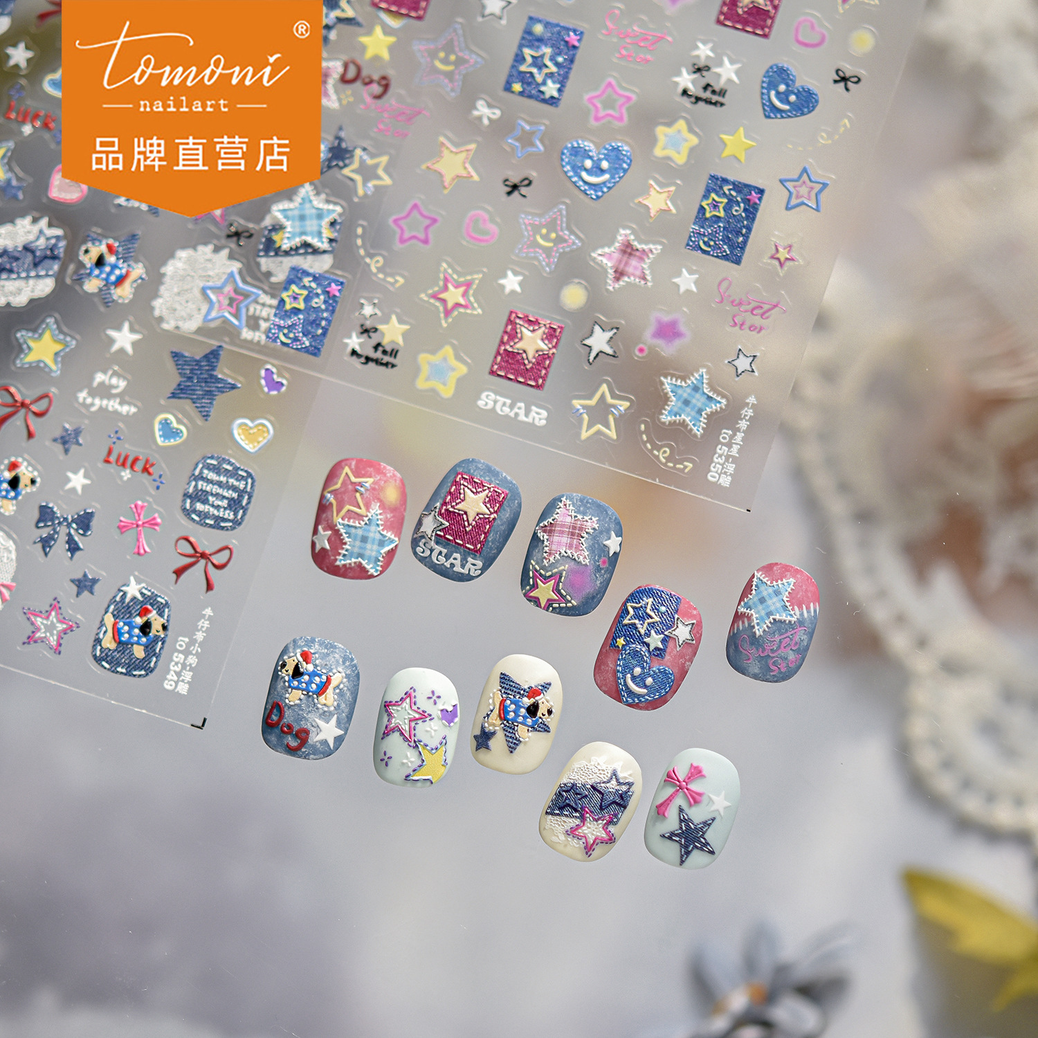 tomoni浮雕立体美甲贴纸复古指甲贴高级感牛仔布星星美甲辅助贴纸