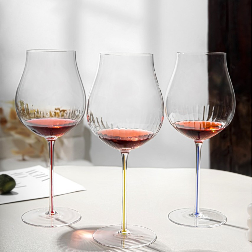 オルガ チューリップ インサート レッド ワイン グラス、ブルー シルク、イエロー シルク、レッド シルク、手吹き一体成型クリスタル