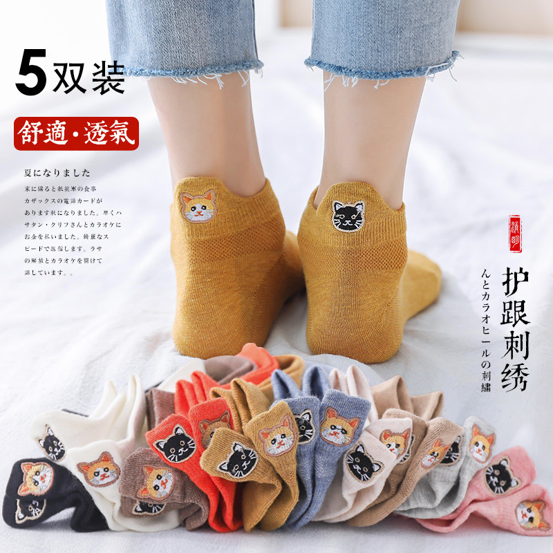 新製品メッシュ通気性かかと刺繍入りABバージョン猫柄レディースボートソックス日本製万能浅履きレディースショートソックス吸汗性と通気性に優れています