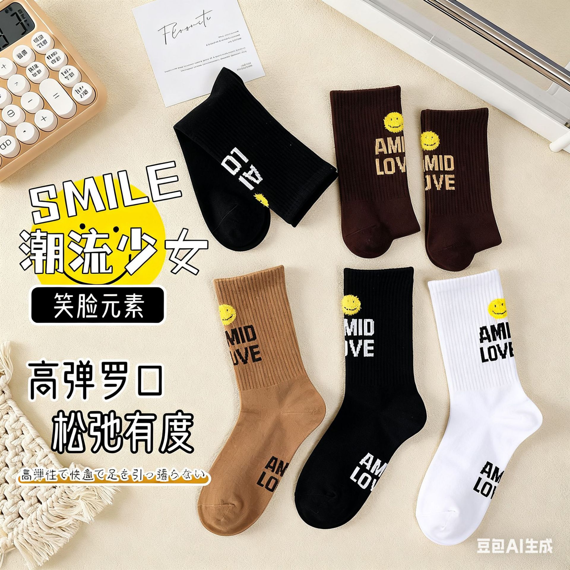 秋冬新作 日本風万能コットンソックス レディース 漫画風ぬいぐるみ笑顔ソックス レディースミドル丈ソックス インス風トレンド重ね履きソックス