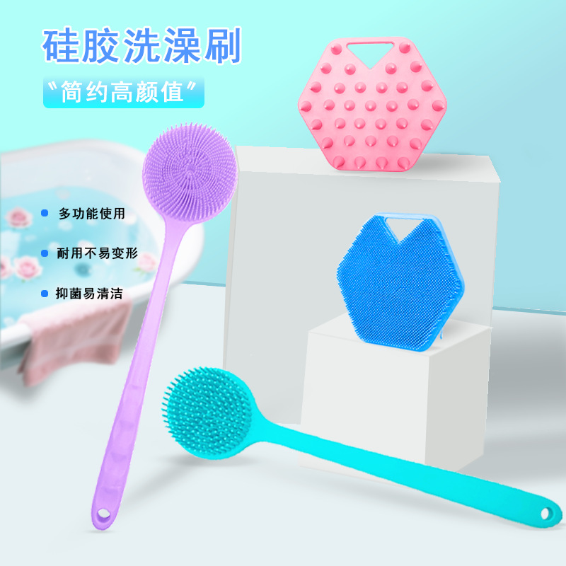 现货硅胶长柄双面加厚洗澡刷家用搓背按摩柔软沐浴刷六边形清洁刷
