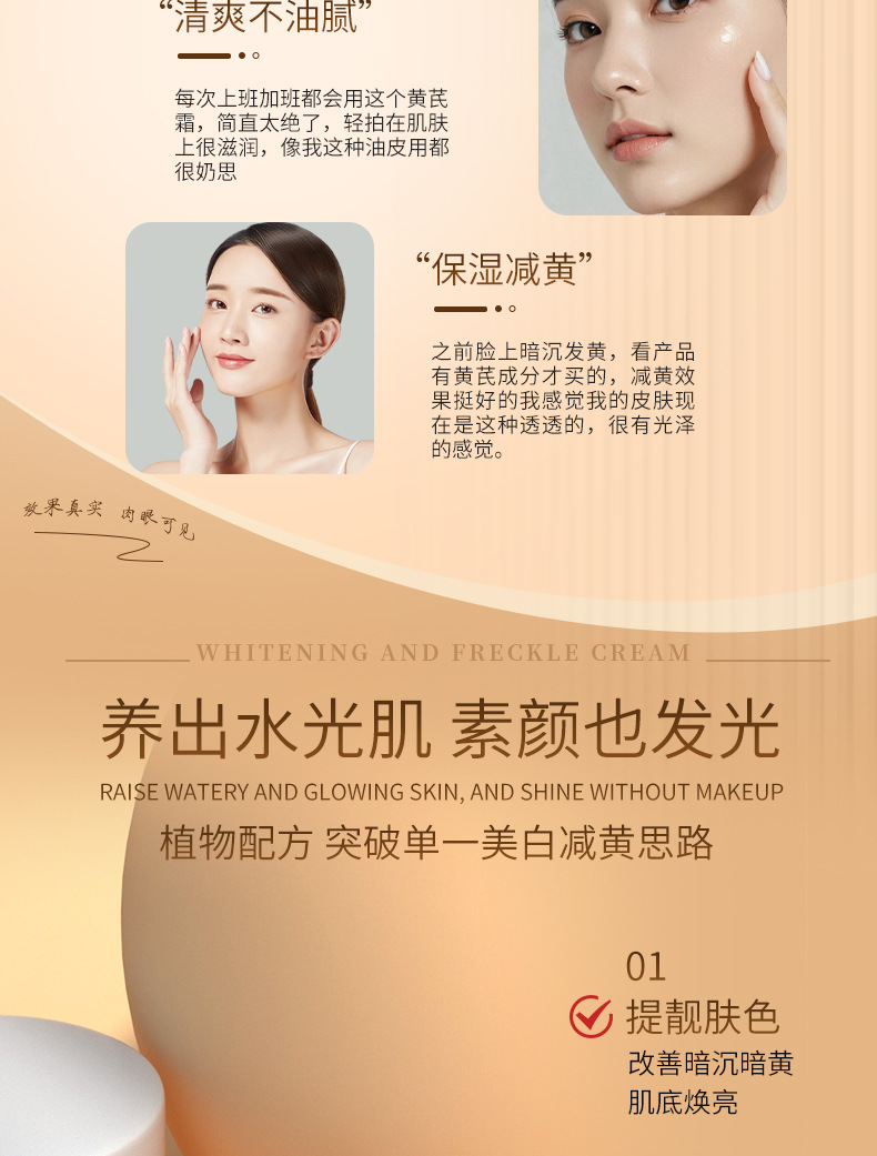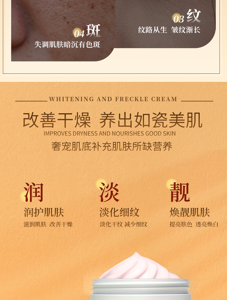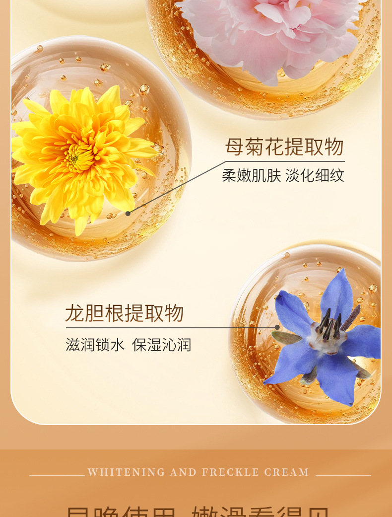 功效:蕴含美白成分,淡化斑点,提亮肤色,改善皮肤暗沉暗黄并预防色素沉积,美白肌肤的同时给予肌肤锁水保湿,长期使用,使肤色美白透亮,焕发白皙光彩。