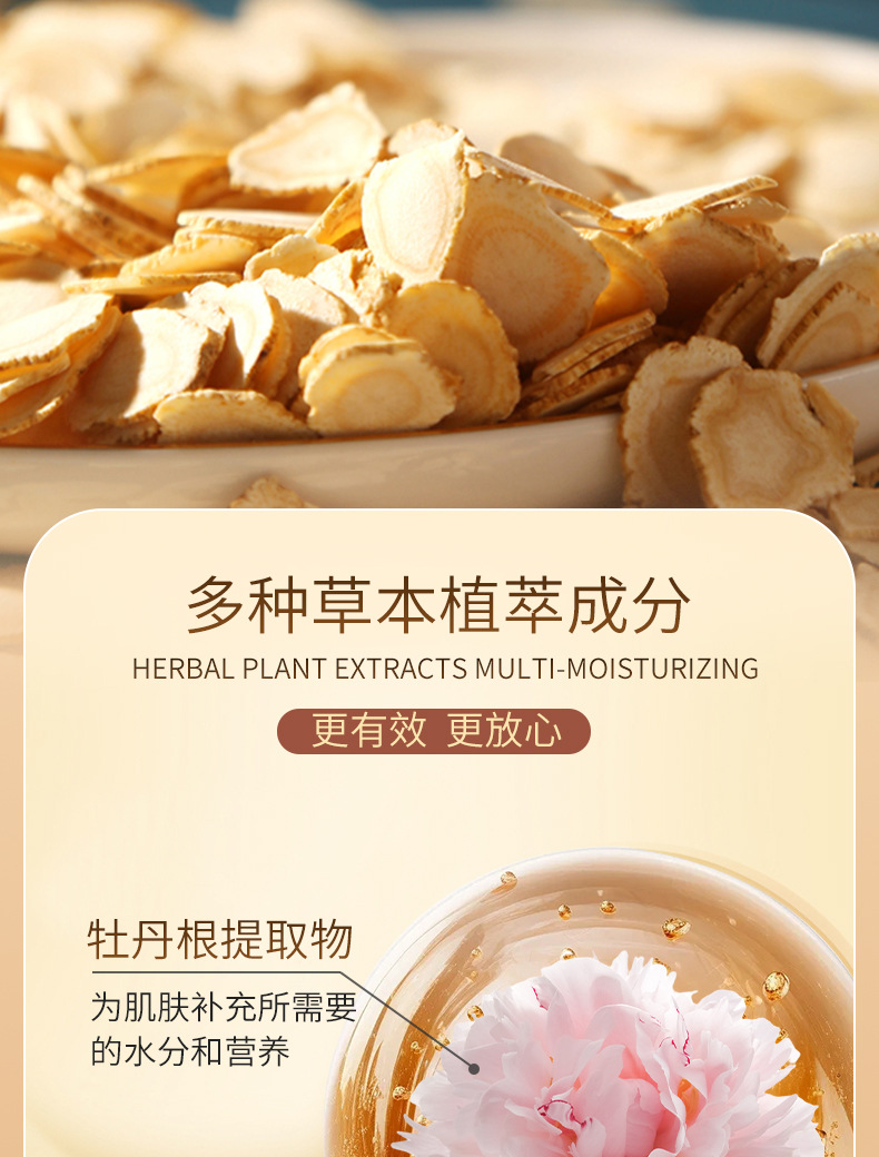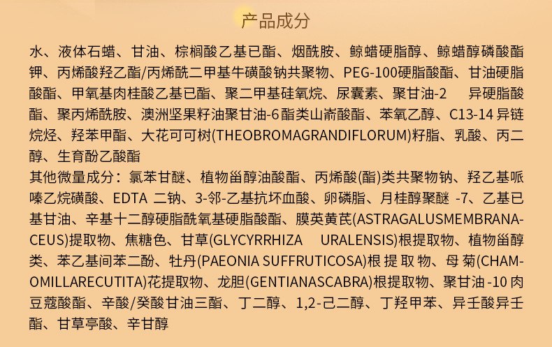 酯、膜荚黄芪(ASTRAGALUS MEMBRANACEUS)提取物、焦糖色、甘草(GLYCYRRHIZA URALENSIS)根提取物、植物甾醇类、苯乙基间苯二酚、牡丹(PAEONIA SUFFRUTICOSA)根提取物、母