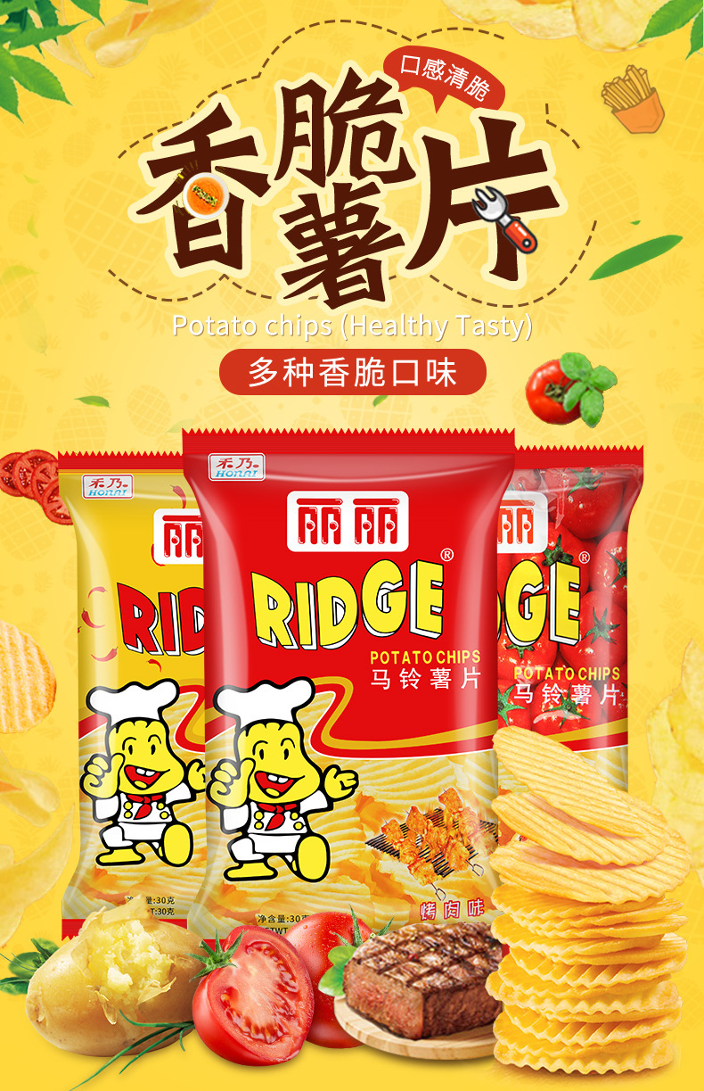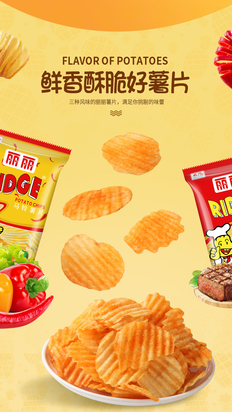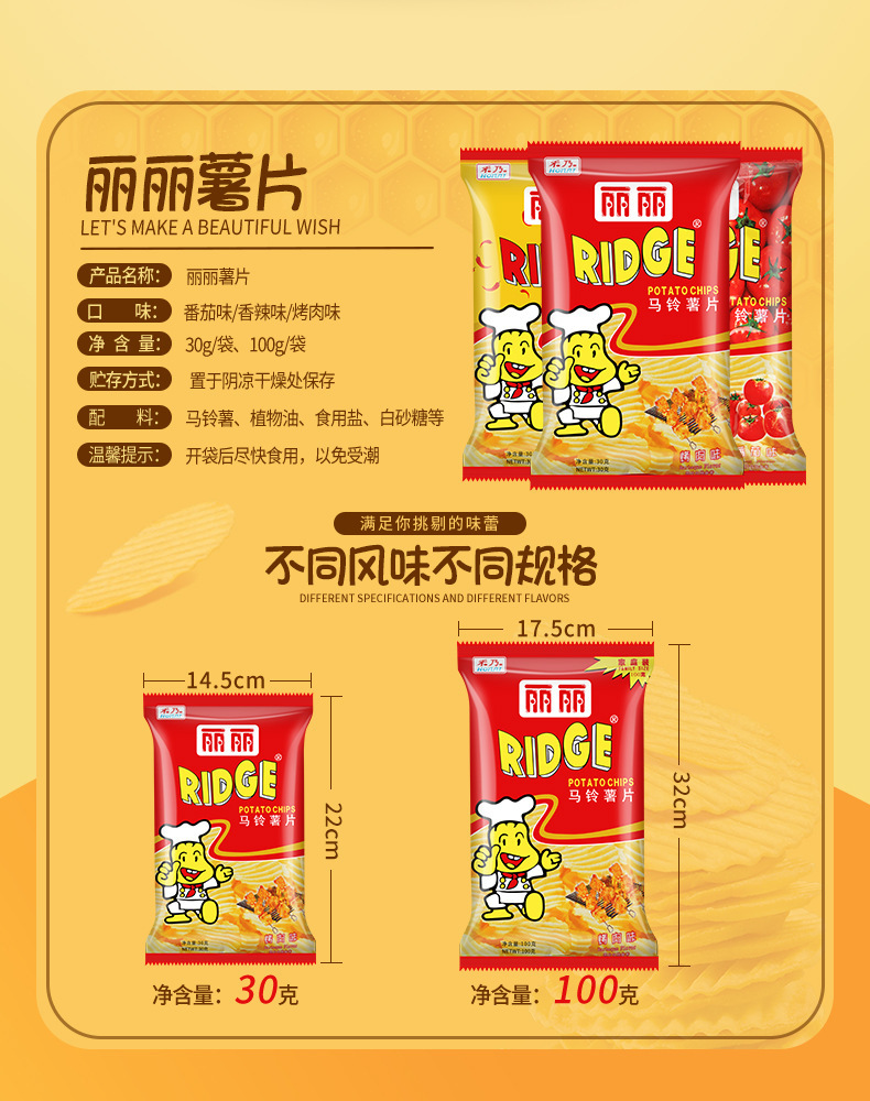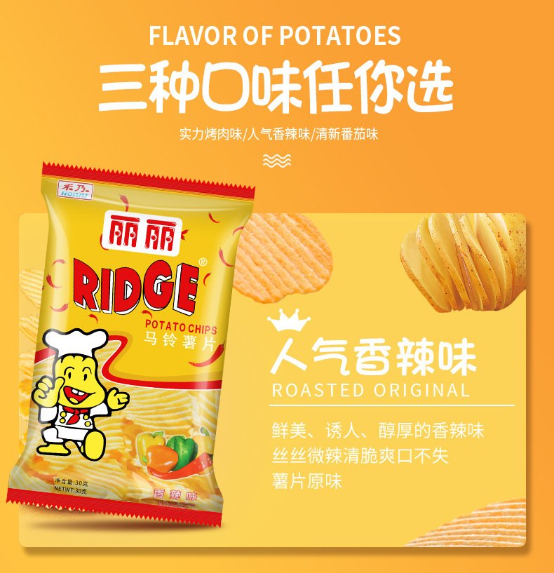 丽丽薯片30g批发休闲零食品烧烤味番茄味烤肉味波浪马铃薯片批发
