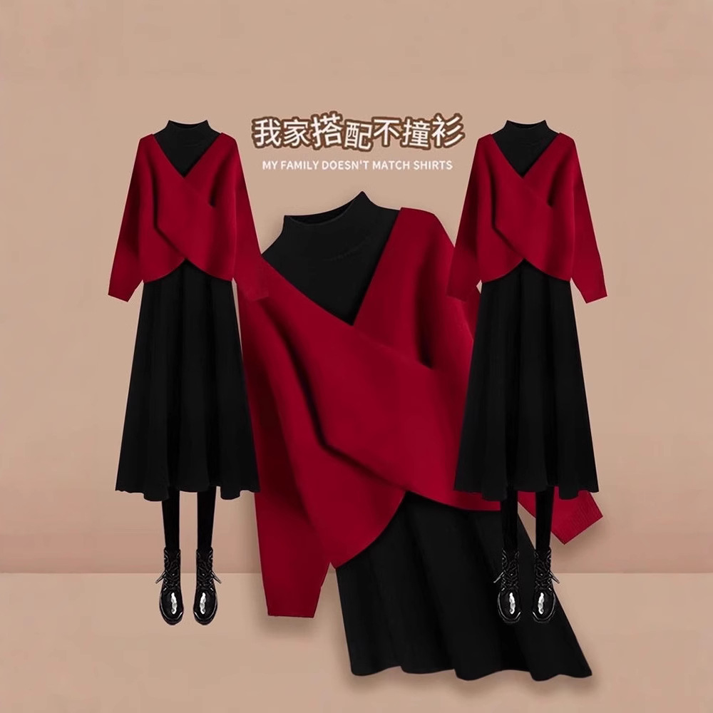フランスの高級感vネック新年セーター高襟ワンピースニット二点セット