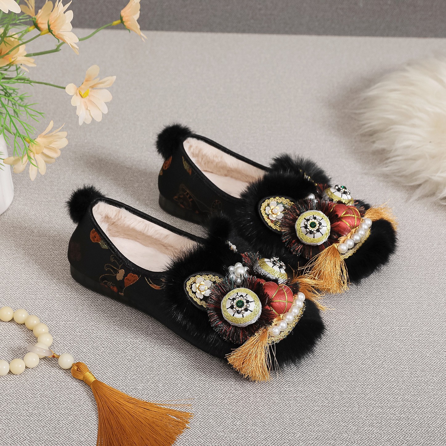 羽华+瑜旋绒内增2025冬新款非遗手工虎头鞋兔毛平底棉鞋中式绣花