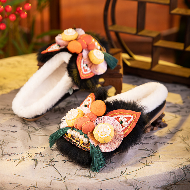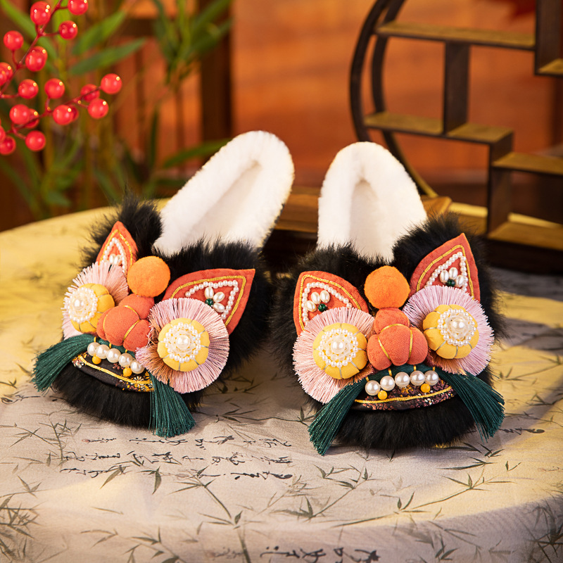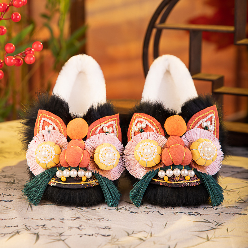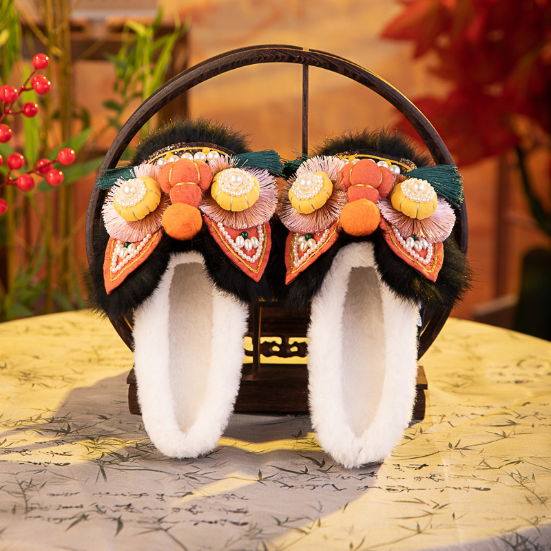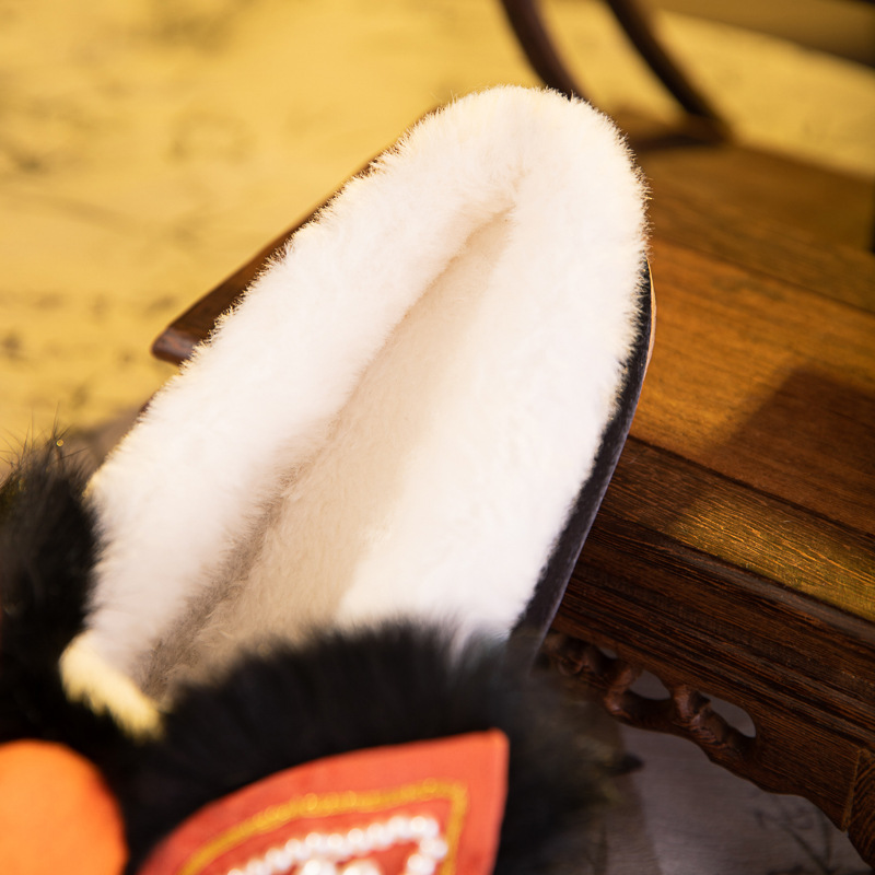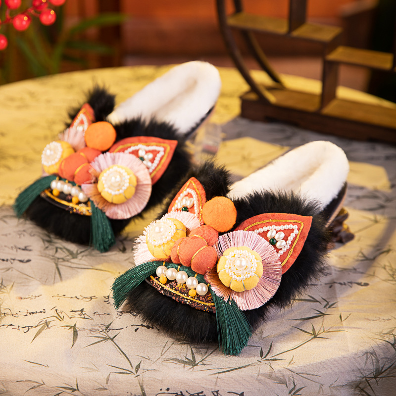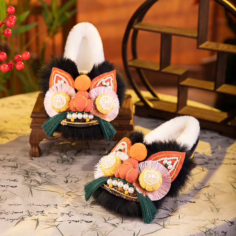 书誉棉拖2025冬新款非遗手工虎头鞋兔毛平底舒适棉鞋中式绣花鞋