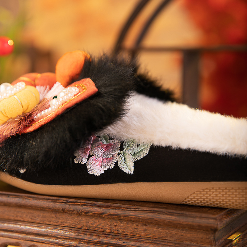 書燕綿2024冬新作、綿入り手作り虎頭靴、ウサギ毛平底快適シングルシューズ、中国風刺繍靴