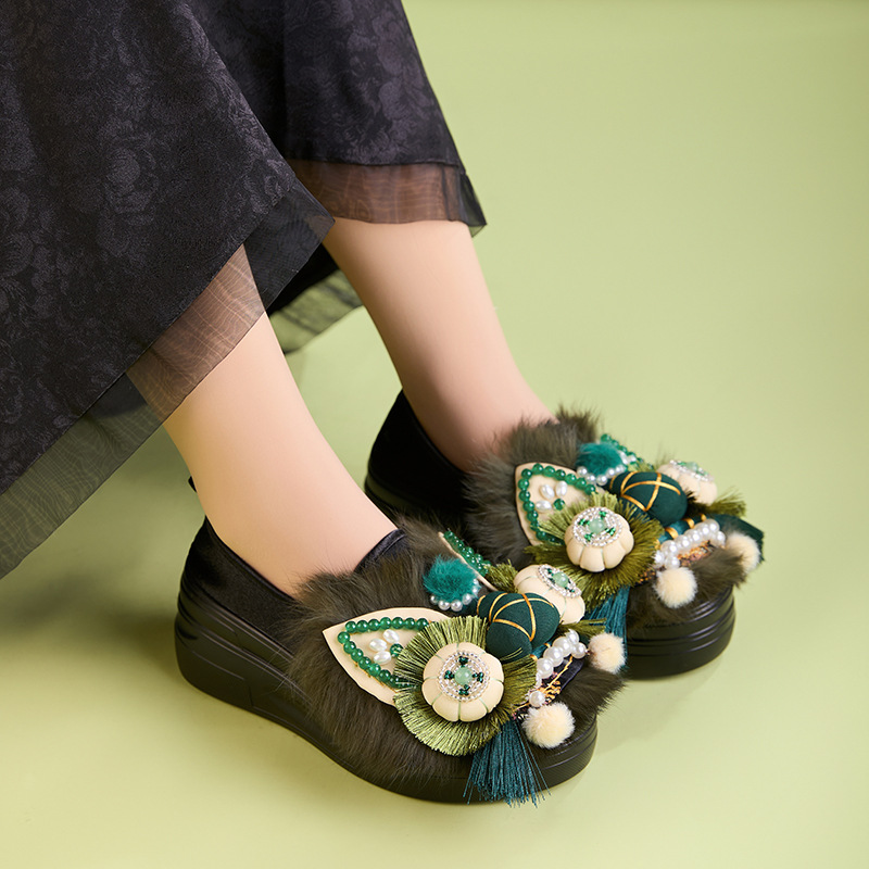 松糕加绒暖秋 虎头鞋2025新款中式轻便厚底增高民族风布鞋女重工
