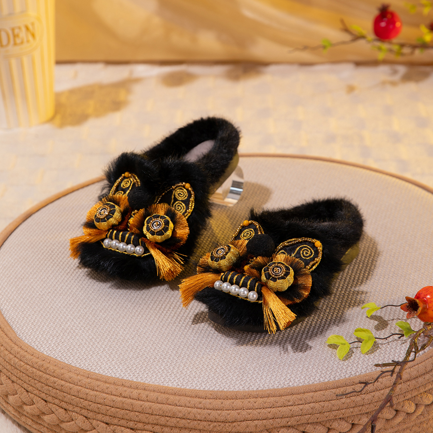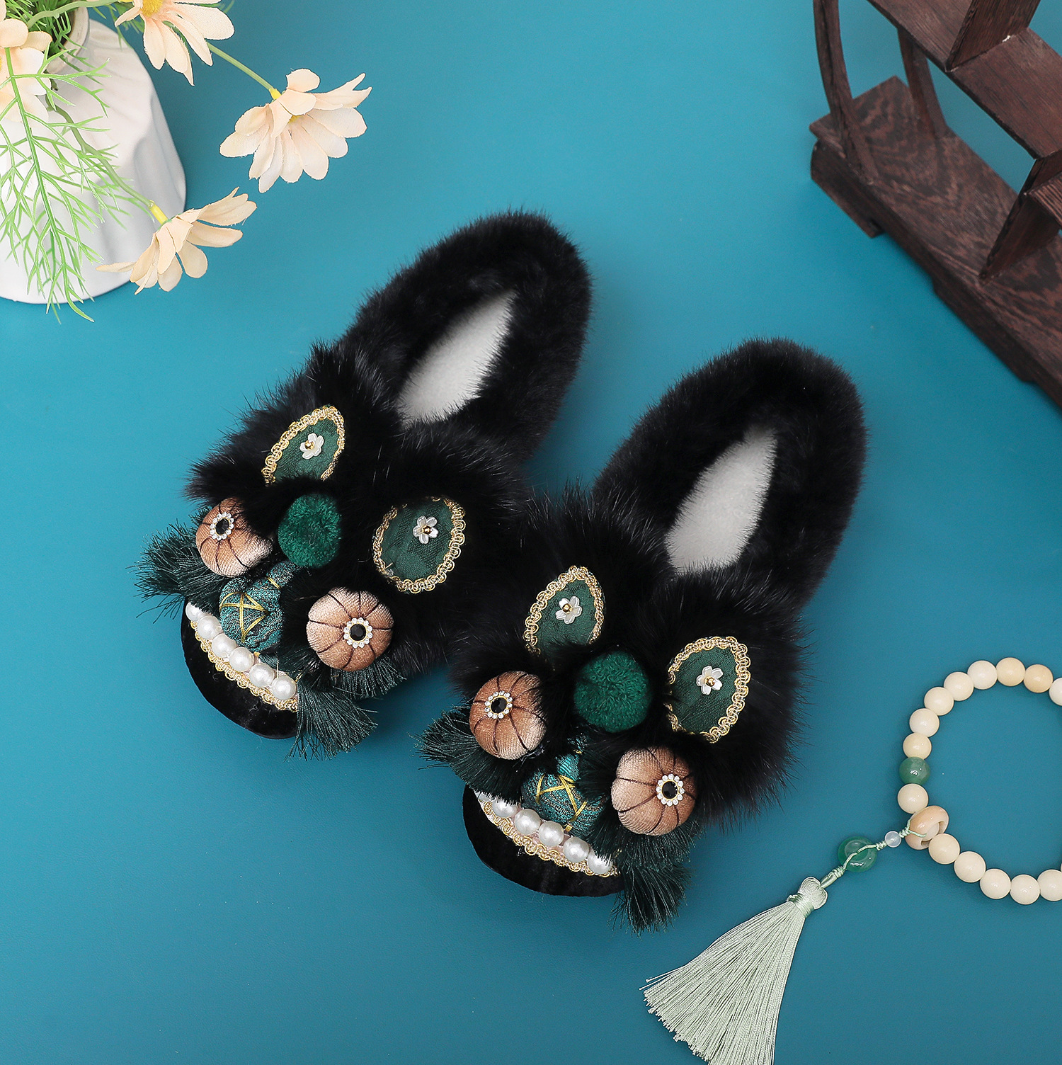 星眸绒灵棉拖2025冬新款非遗手工虎头鞋兔毛平底舒适棉鞋中式绣花
