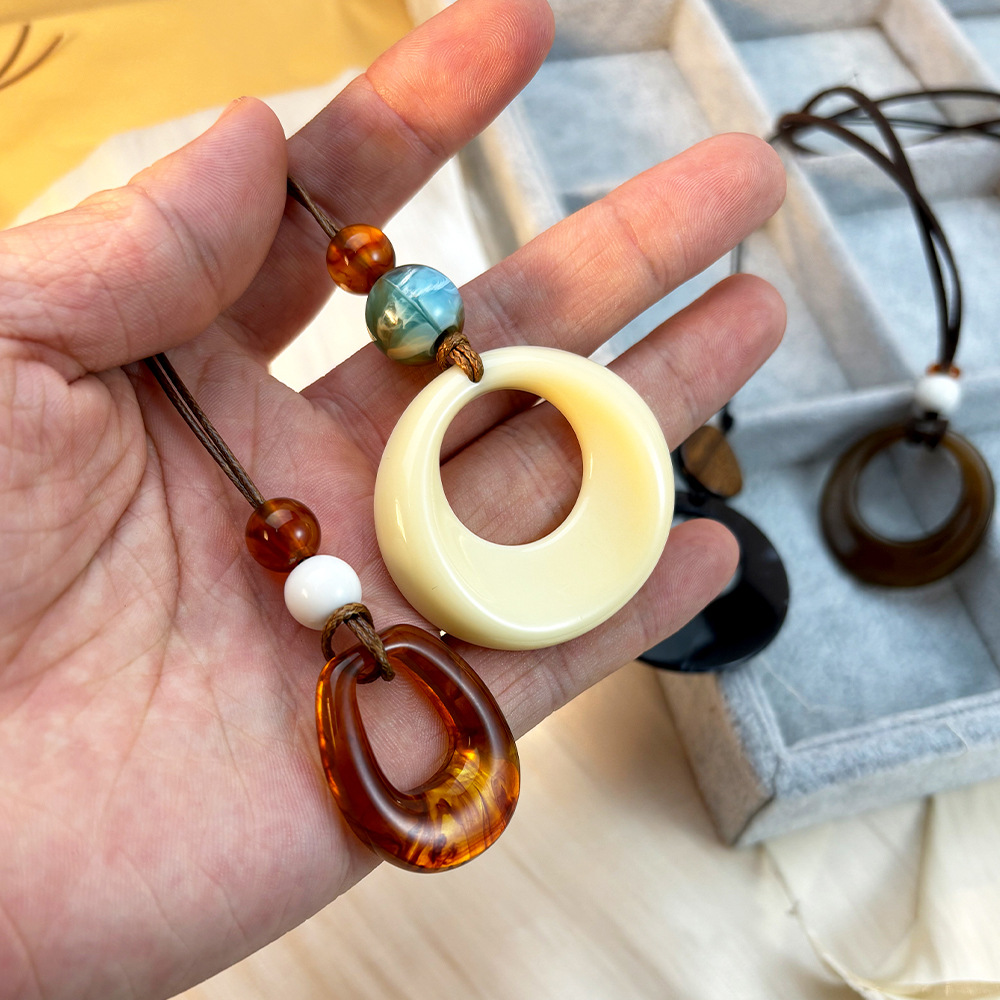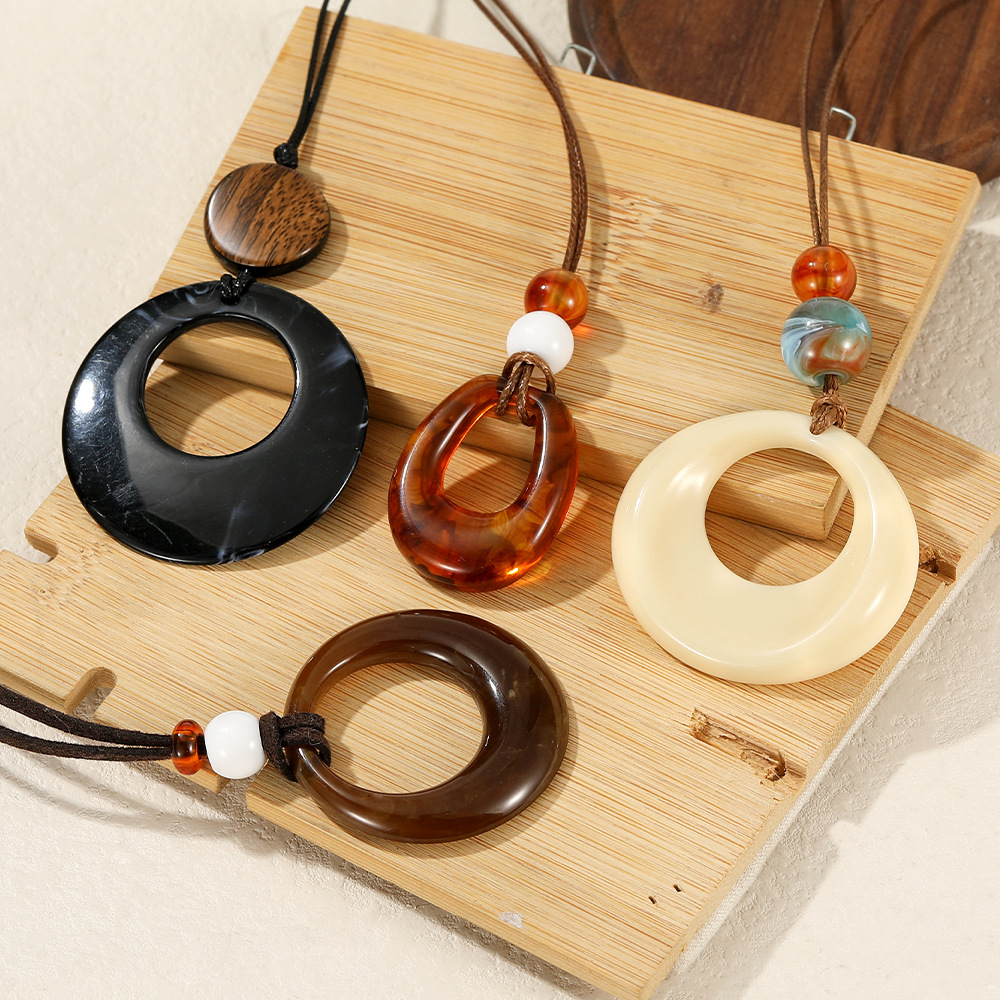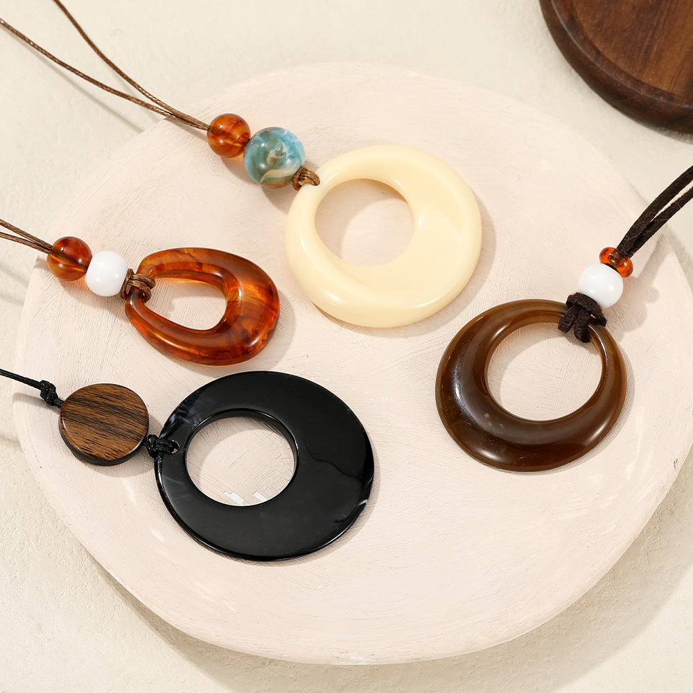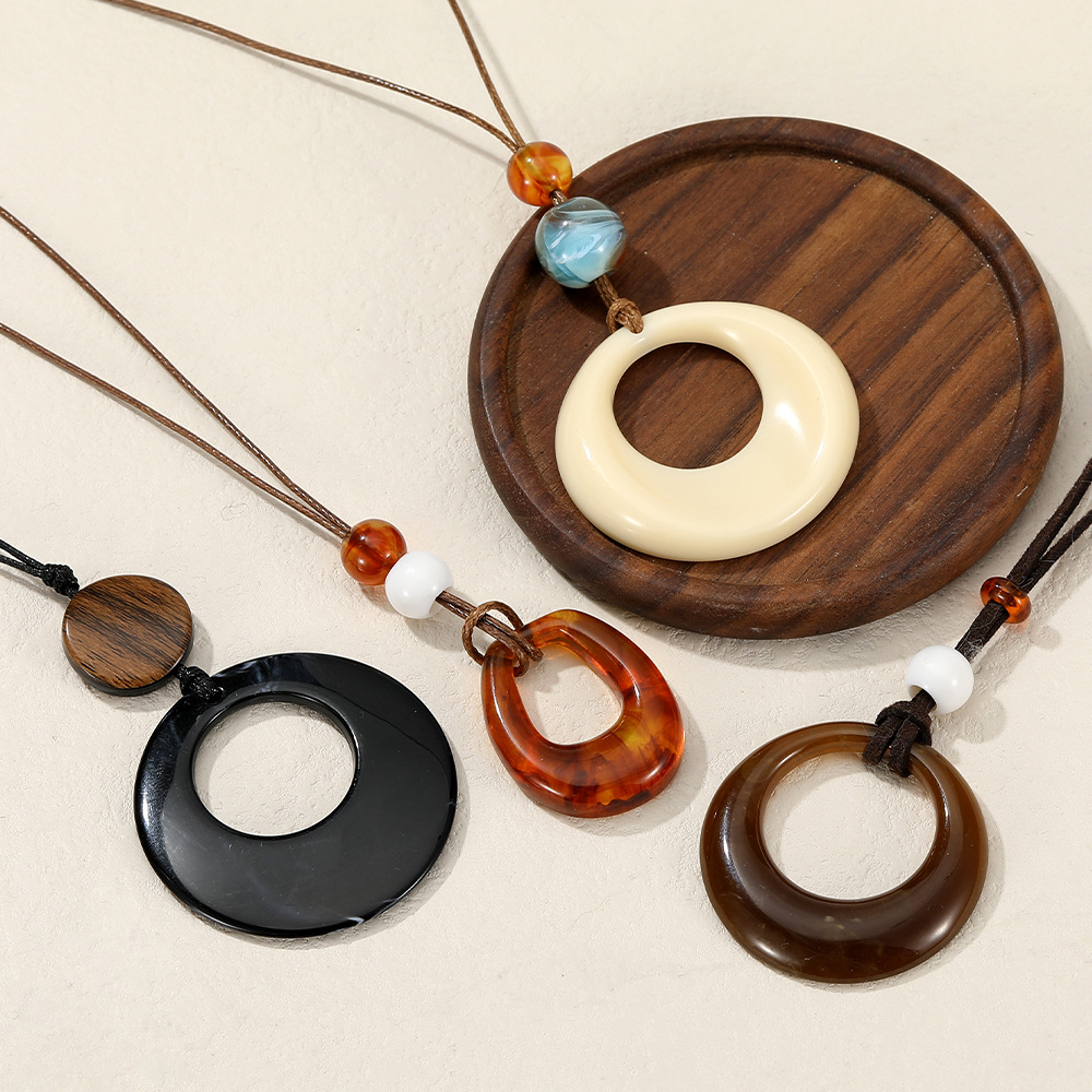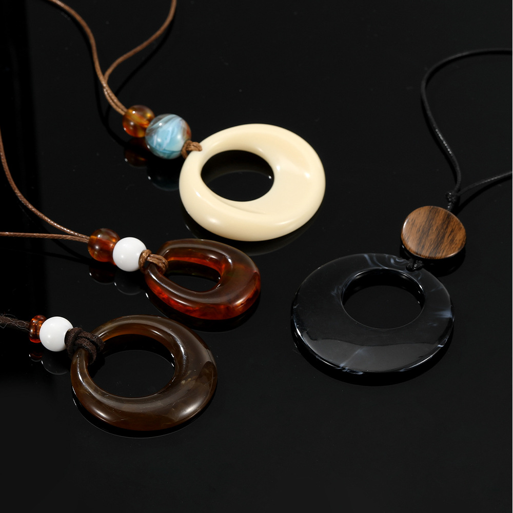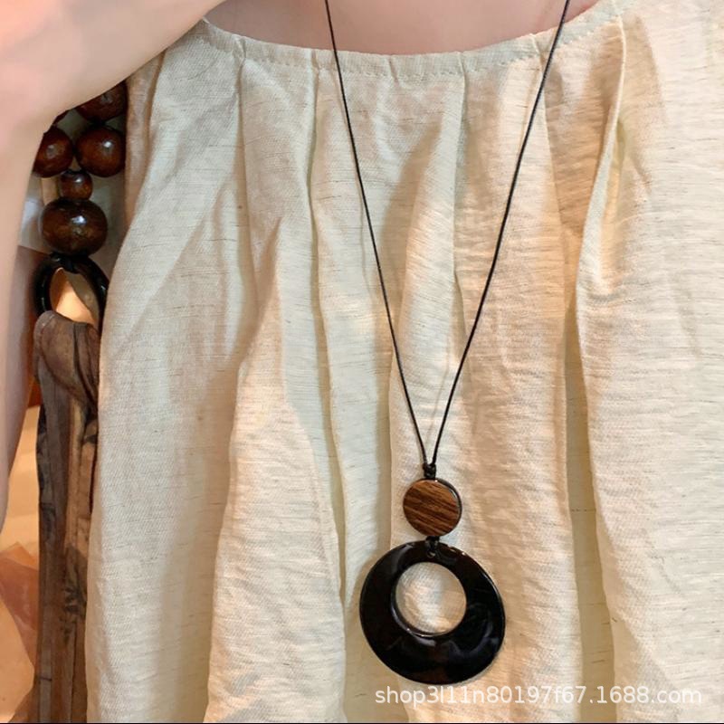 新中式镂空木质圆形吊坠项链女民族风小众设计毛衣链复古挂脖配饰