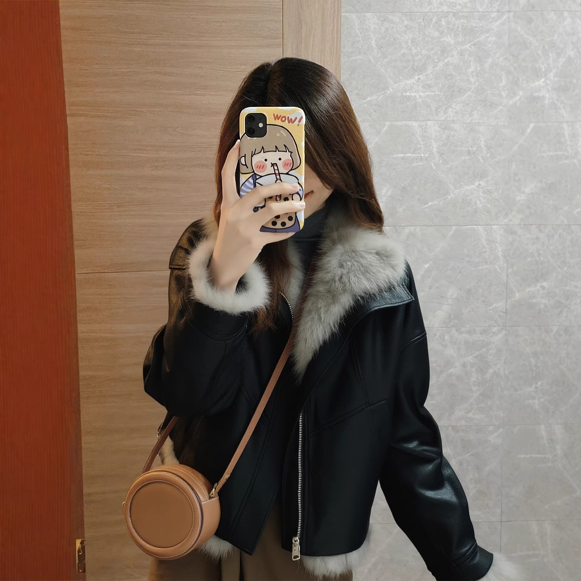 现货 巨好看的初冬黑色机车服皮毛一体短款羊羔绒夹克外套女冬季