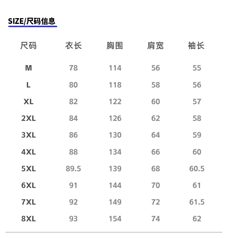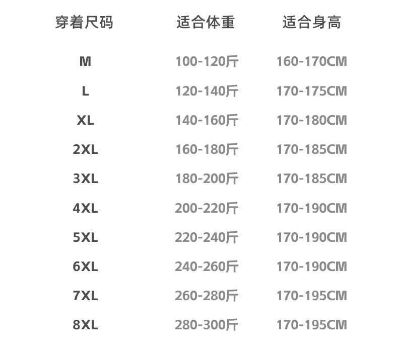 160(M): 60kg 以内,165(L): 70kg 以内,170(XL): 80kg 以内,175(2XL): 90kg 以内,180(3XL): 100kg 以内,185(4XL): 110kg 以内,5XL ( 120kg 歳以内),6XL ( 130kg 歳以内),7XL ( 140kg 歳以内),8XL ( 150kg 歳以内)
