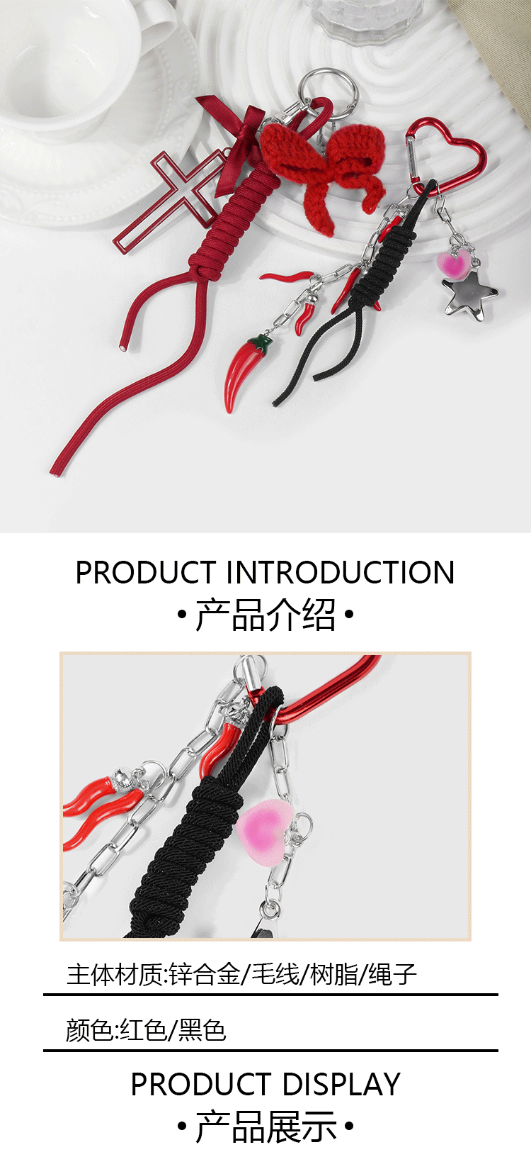 赤いリボンの十字キーホルダー 1 個,赤い模擬小さなペッパースターラブキーホルダー 1 個