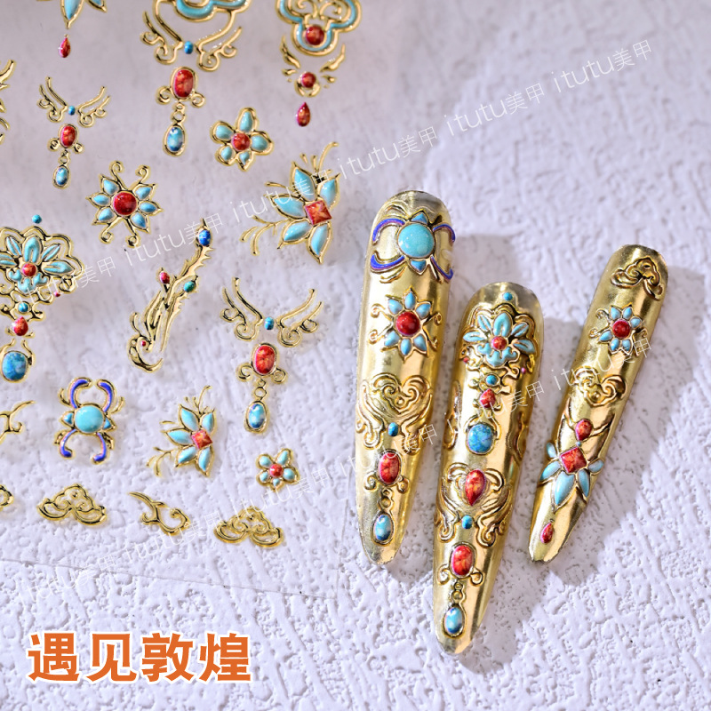 中国風と敦煌の美しさを融合させたネイルステッカー、宝石装飾、豪華な宮廷風、浮き彫り金箔装飾、小柄装飾品