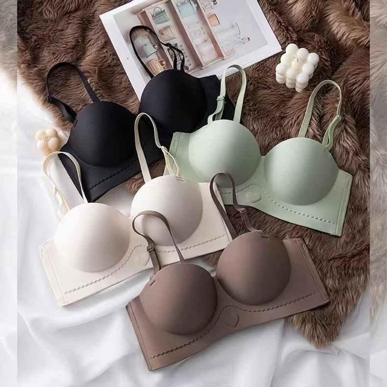 英国風レターデザインワンピース型シームレスレディースブラ、ノンワイヤー、上向きサポート、小胸用厚カップブラジャー