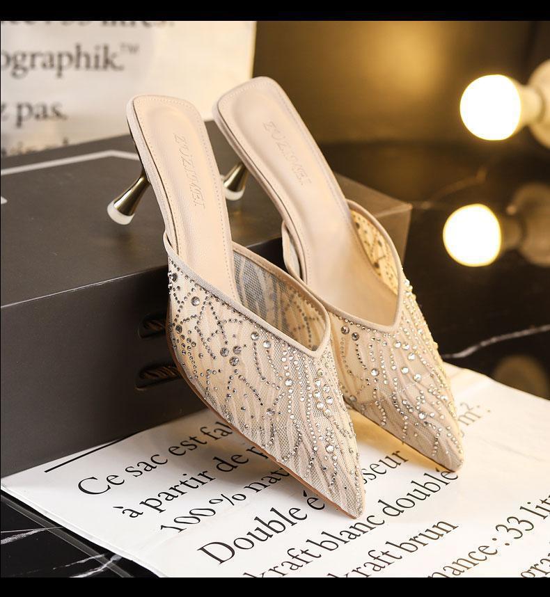 ポインテッドトゥラインストーン包頭スリッパ女性のための夏 2025 新しいハーフスリッパメッシュクリスタルスティレットヒールノンスリップサンダル女性のための
