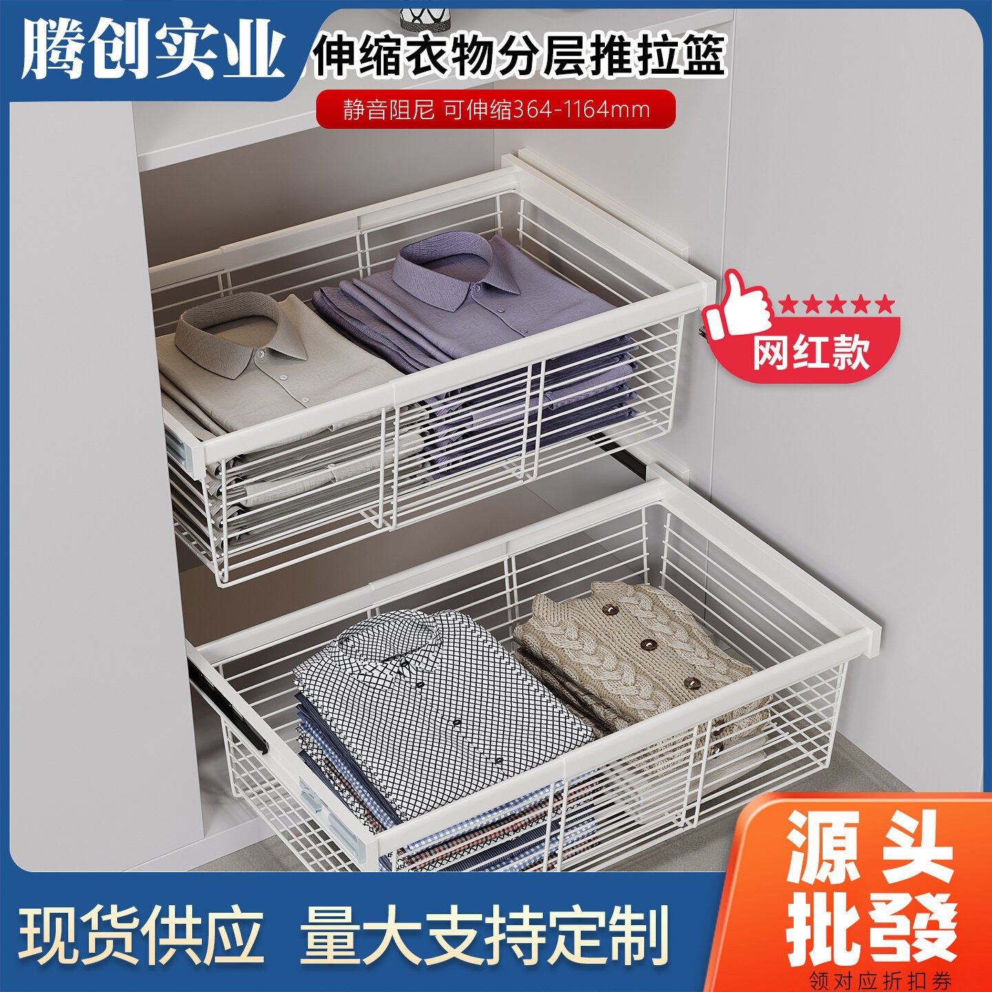 衣柜拉篮抽屉式伸缩阻尼滑轨衣帽间衣物架内置收纳分层推拉篮网篮