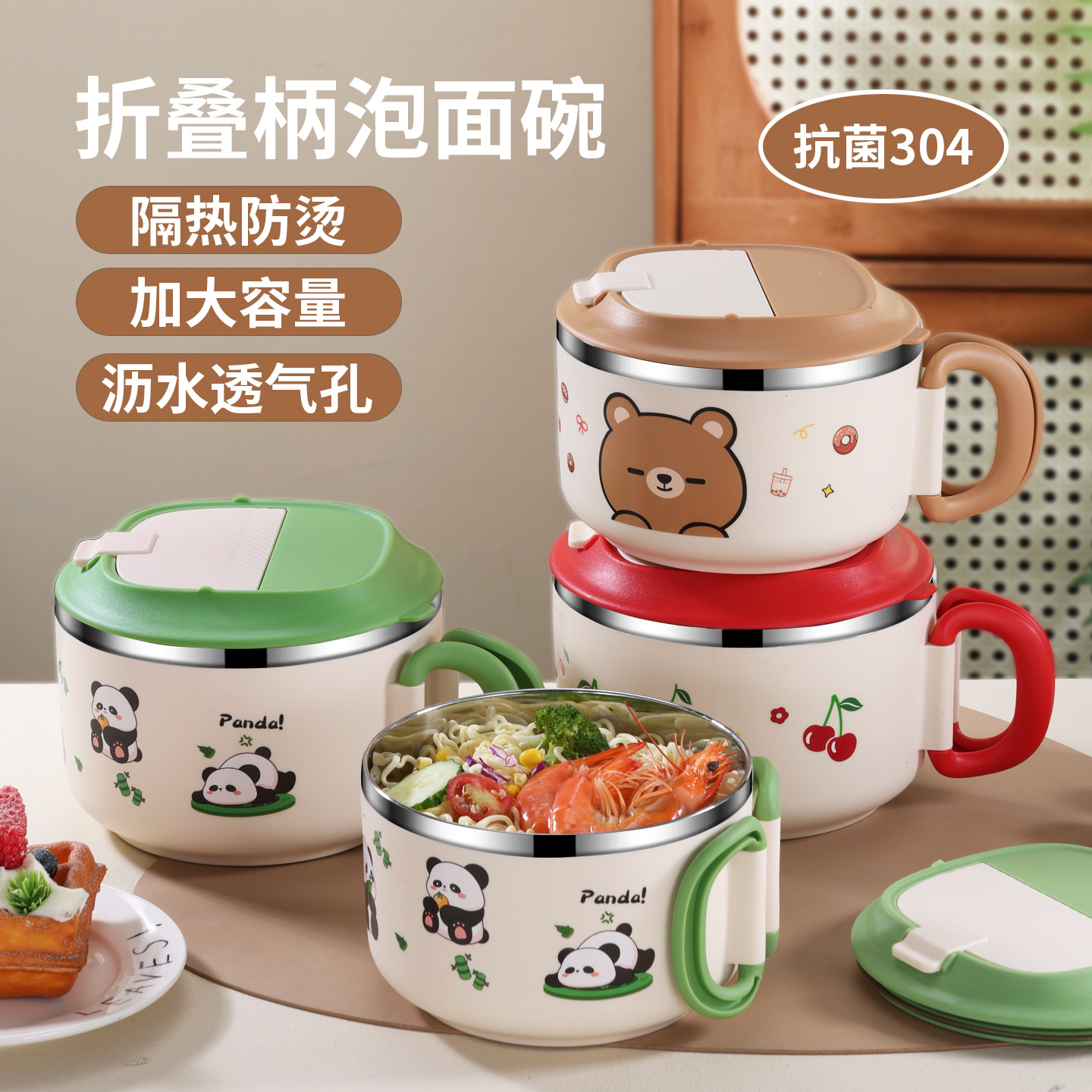 乐美304不锈钢泡面碗学生宿舍卡通大容量泡面杯折叠手柄带盖汤碗