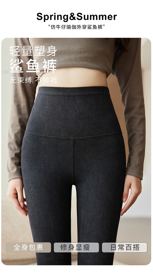 新款仿牛仔瑜伽裤高腰口袋显瘦鲨鱼裤女大码提臀无尴尬九分打底裤