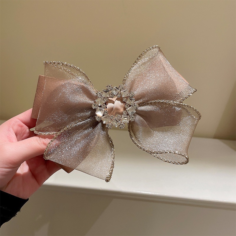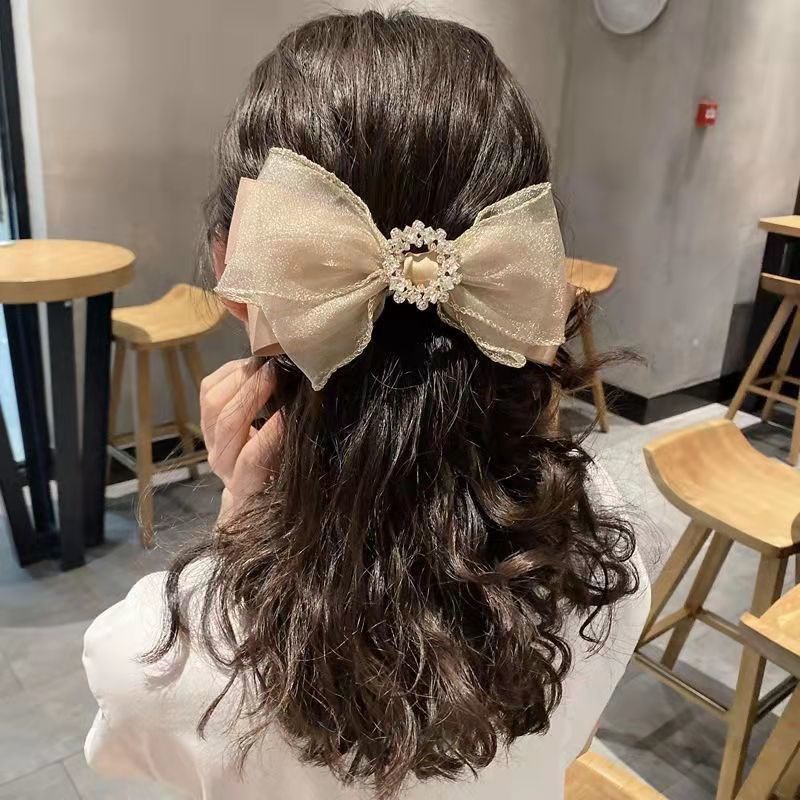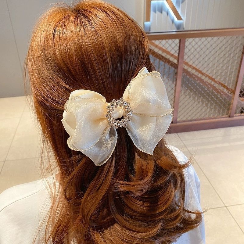 ダイヤモンド付き蝶結びスプリングクリップ、韓国風スイートヘアアクセサリー、オーガンジー素材のヘアクリップ、おしゃれな後頭部ヘアピン、ヘアアクセサリー
