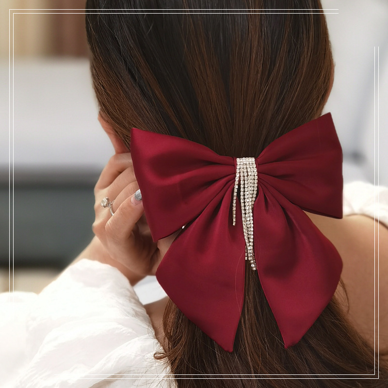 人気のリボンヘアクリップ、高級感のある赤色の妖精風ヘアアクセサリー、後頭部用サテンリボンヘアクリップ