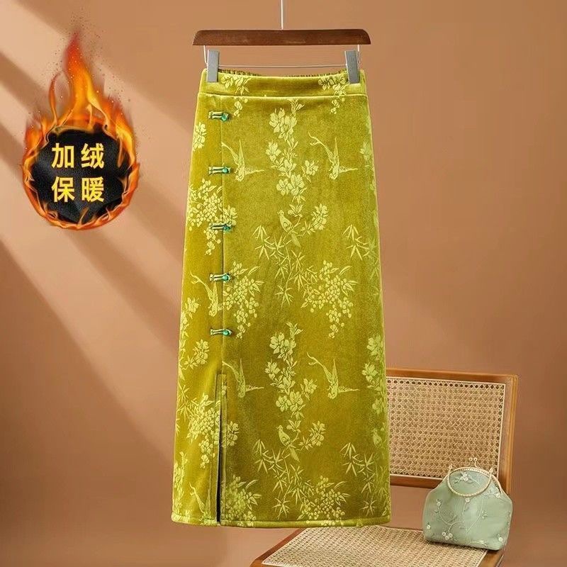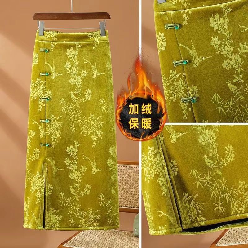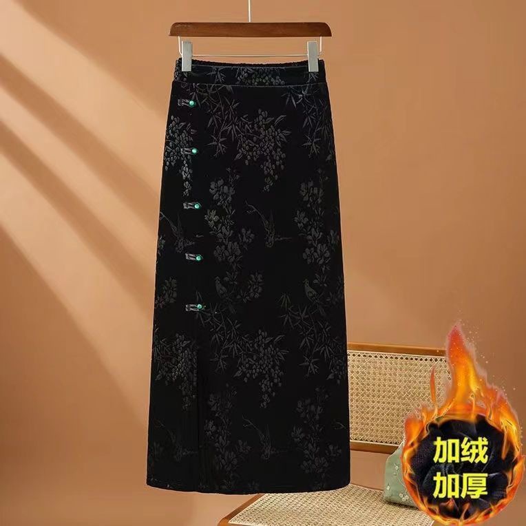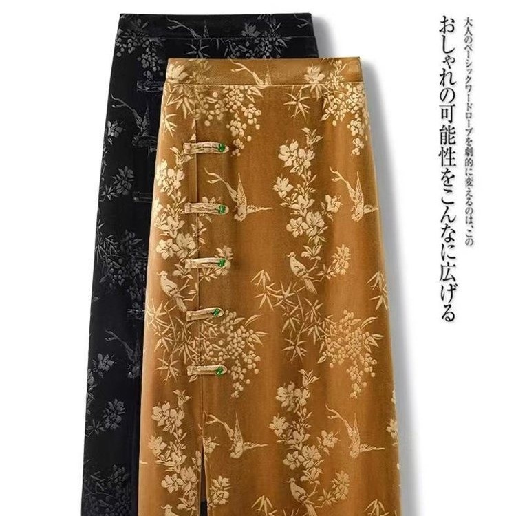 新中式民族風婦人服秋冬2025新作ハイウエストAラインスカートレトロ花柄ボタン付きヒップスカート